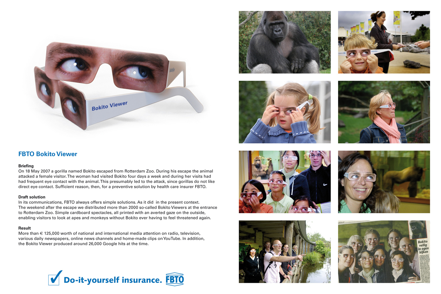 Страховая компания FBTO предлагает защищать себя своими силамиНидерландская страховая кампания FBTO решило привлечь к себе внимание посетителей зоопарка Rotterdam Zoo, распространив среди них специальные очки для общения с приматами, названные по имени гориллы Бокито (Bokito). 18 мая это животное сбежало из клетки и напало на женщину из-за того, что она смотрела в глаза горилле. Компания FBTO предлагает посетителям зоопарка защитить себя самим и не смотреть в глаза животным.Эта рекламная акция стала бронзовым призером в категории Promo Lions на Cannes Lion 2008. Агентство: DDB, Амстердам, Нидерланды Творческий директор: Martin Cornelissen Арт директор: Chris Sant, Marco Sluijter Копирайтер: Dieuwer Bulthuis, Jeroen de Korte |