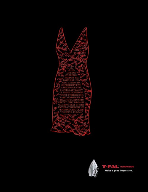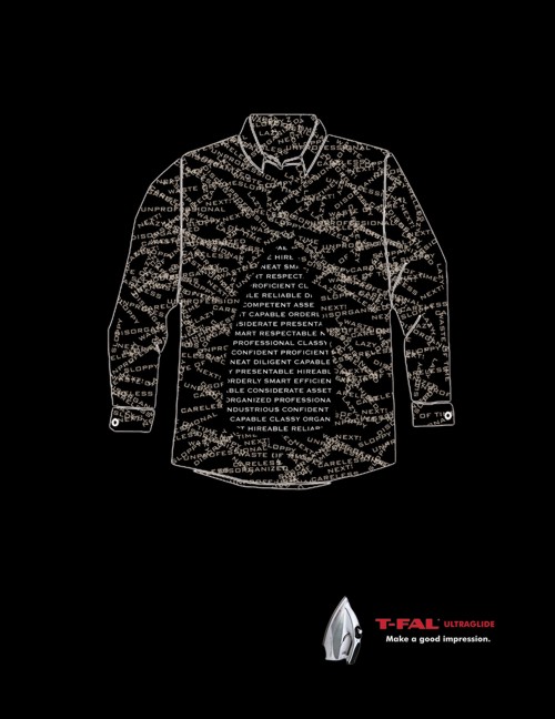 Утюг T-fal придаcт одежде привлекательностьКреаторы из рекламной школы Humber College с помощью принтов рекламирующих довольно странный бренд бытовой техники T-fal доказали явное преимущество глаженой одежды перед мятой. Стоит утюгу этой самой фирмы T-fal проитись по вашей одежде, как грязь и отвращение сменяются привлекательностью и достоинством.Произведи хорошее впечатление Рекламная школа: Humber College, Toronto, Canada Копирайтер: Mith Das |