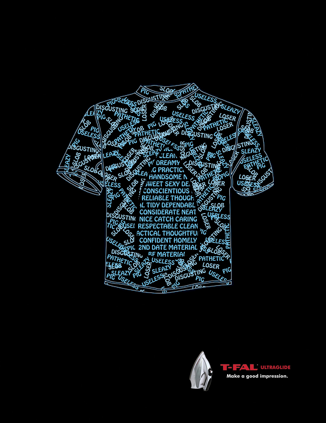 Утюг T-fal придаcт одежде привлекательностьКреаторы из рекламной школы Humber College с помощью принтов рекламирующих довольно странный бренд бытовой техники T-fal доказали явное преимущество глаженой одежды перед мятой. Стоит утюгу этой самой фирмы T-fal проитись по вашей одежде, как грязь и отвращение сменяются привлекательностью и достоинством.Произведи хорошее впечатление Рекламная школа: Humber College, Toronto, Canada Копирайтер: Mith Das |