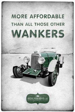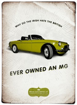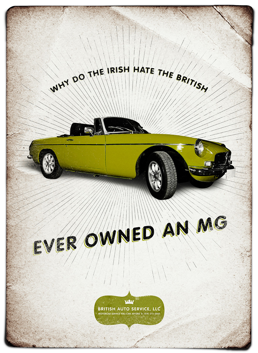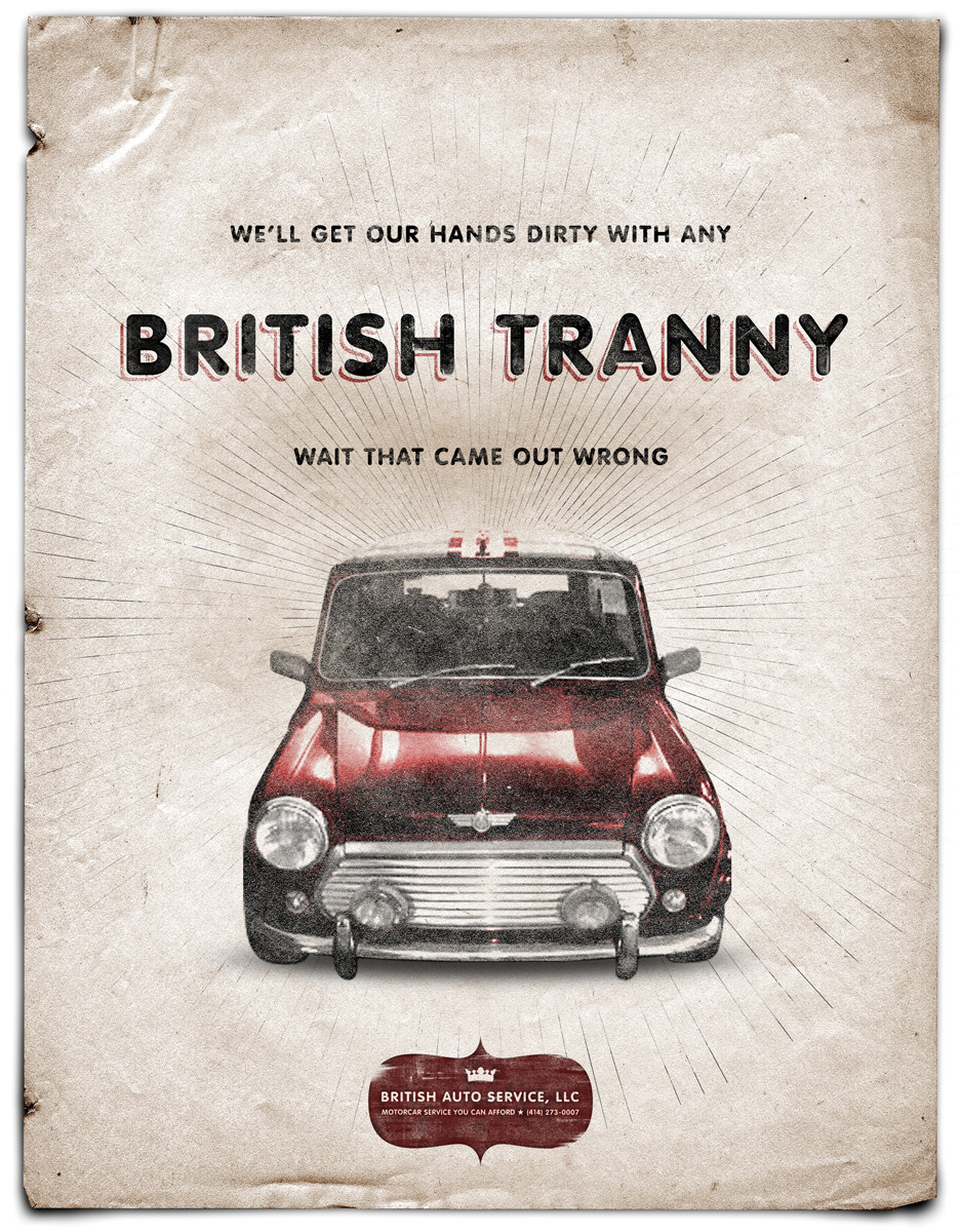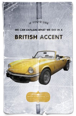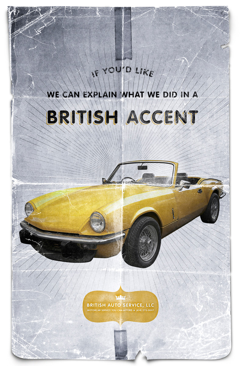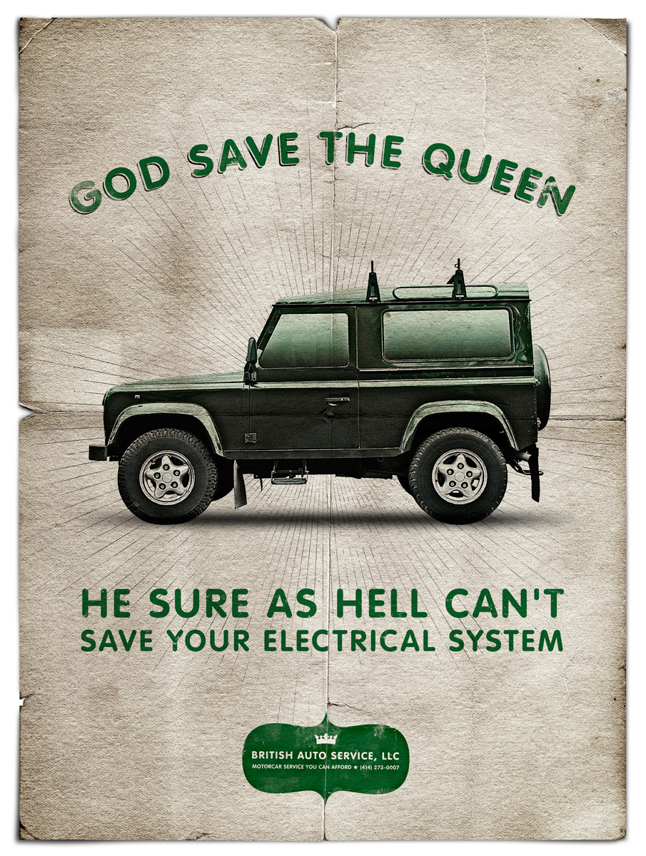 British Auto Service приходит на помощь горе-владельцу английского автоАвто-слесари с большой неохотой берутся ремонтировать английские автомобили. И поэтому потребителю приходится обращаться в компанию-дилера, что влечет за собой серьезные денежные затраты. Но не все так плохо, как может показаться на первый взгляд. British Auto Service совместно с РА STIR предлагает потребителю решение любых проблем связанных с ремонтов английских авто. И что самое интересное, за вполне умеренную плату.Агентство: STIR, Milwaukee, USA Креативный директор: Steve Koeneke Арт директор: Brian Steinseifer Копирайтер: Steve Koeneke |
