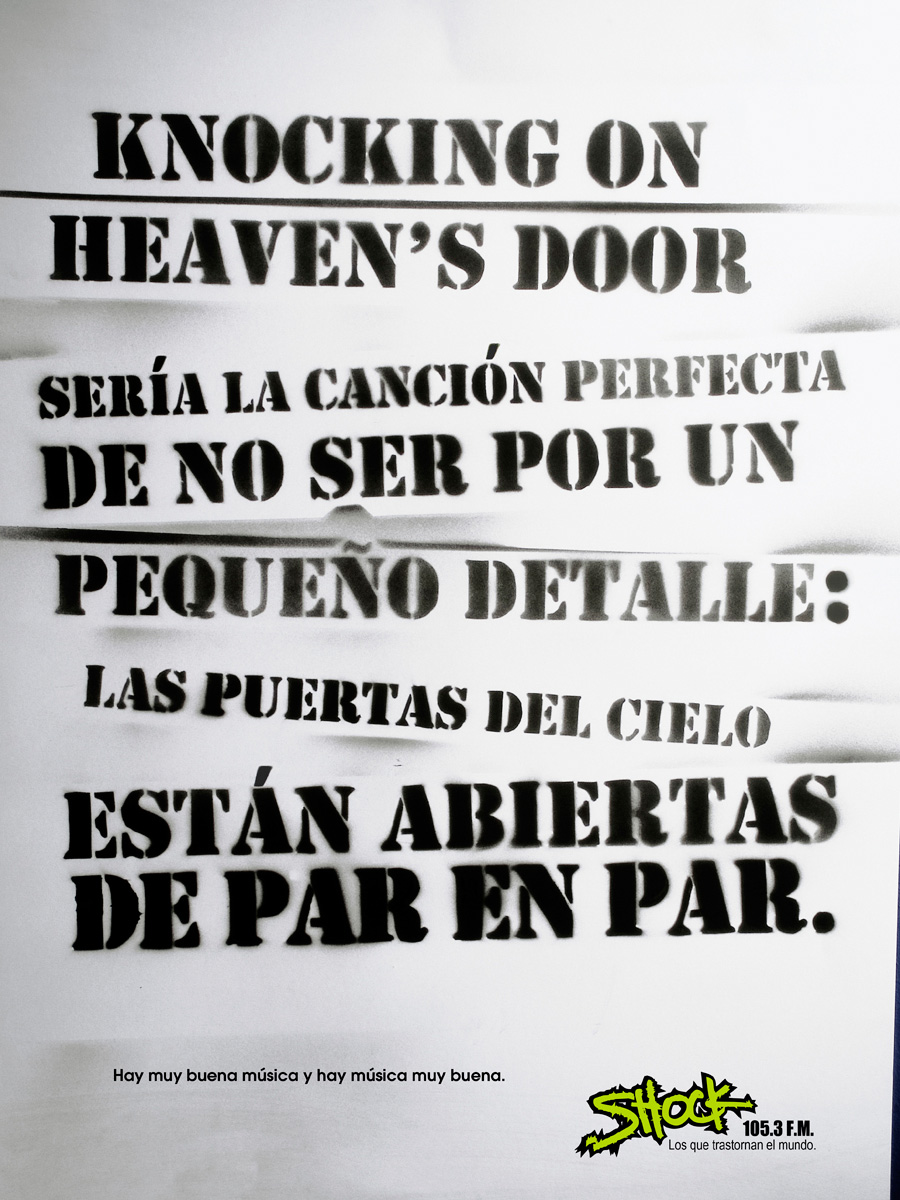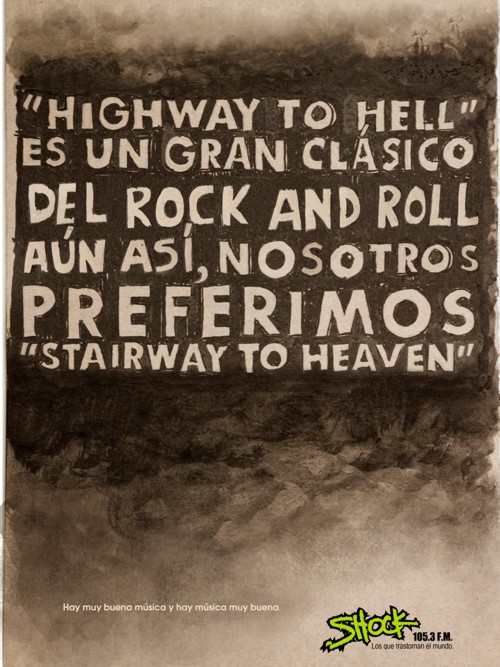 Только хорошая музыка на христианском радио Shock FMРелигиозная радиостанция Shock совместно с РА BBDO считают, что каждая песня может быть оценена по двум критериям, а именно: непосредственно качество самой музыкальной композиции и эмоции, которые испытывает слушатель. Именно поэтому "Highway to hell" является хорошей песней, но для своих радиослушателей Shock выберет "Stairway to heaven".Есть очень хорошая музыка и музыка, которая является очень хорошей Агентство: BBDO Guatemala Копирайтер: Victor Garcia Арт директор: Mario Guerra |
