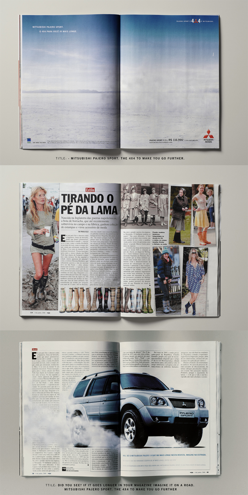 Mitsubishi Pajero Sport разъезжает по страницам модного журналаЧтобы показать, насколько автомобиль Mitsubishi Pajero Sport мощен и быстр, бразильское рекламное агентство Africa S?o Paulo решило в качестве рекламного носителя использовать несколько разворотов модного журнала, на первом из которых мы не увидим самой машины, которая успела уехать немного дальше.Агентство: Africa Sao Paulo, Бразилия Фотограф: Paulo Mancini Главный творческий директор: Nizan Guanaes, Sergio Gordilho Творческий директор: Humberto Fernandez, Flavio Waiteman Арт-директор: Humberto Fernandez Копирайтер: Flavio Waiteman |