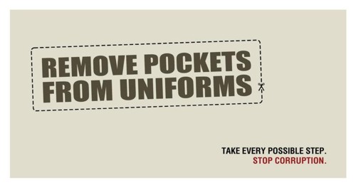 Агентство RK SWAMY/BBDO предложило новый способ для борьбы с коррупциейЭтот плакат, созданный индийским агентством RK SWAMY/BBDO Kolkata, взял Серебро на Outdoor Advertising Convention Asia 2008 (OAC Asia 2008). Надпись на плакате призывает убрать все карманы с униформы государственных служащих, так как это один из возможных способов борьбы с коррупцией."Уберите карманы с униформы. Примите все возможные меры. Остановите коррупцию." Агентство: RK SWAMY/BBDO Kolkata Творческий директор: Sanjeev Dassani Арт-директор: Aanton Mookherjee Копирайтер: Sanjeev Dassani |