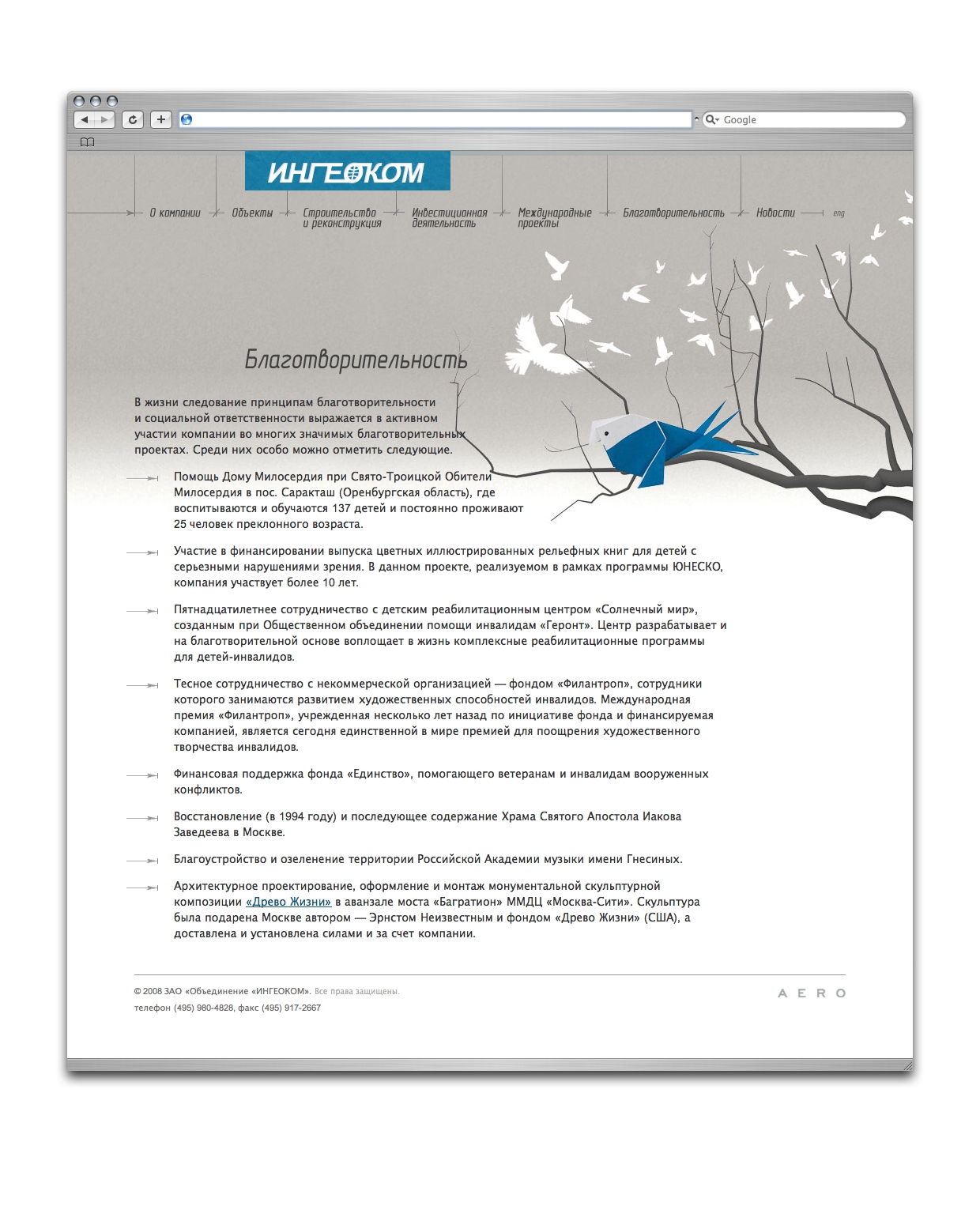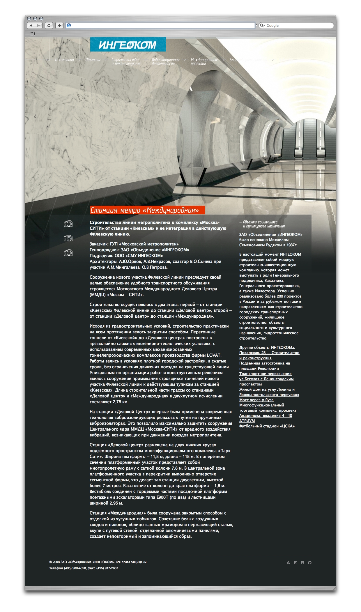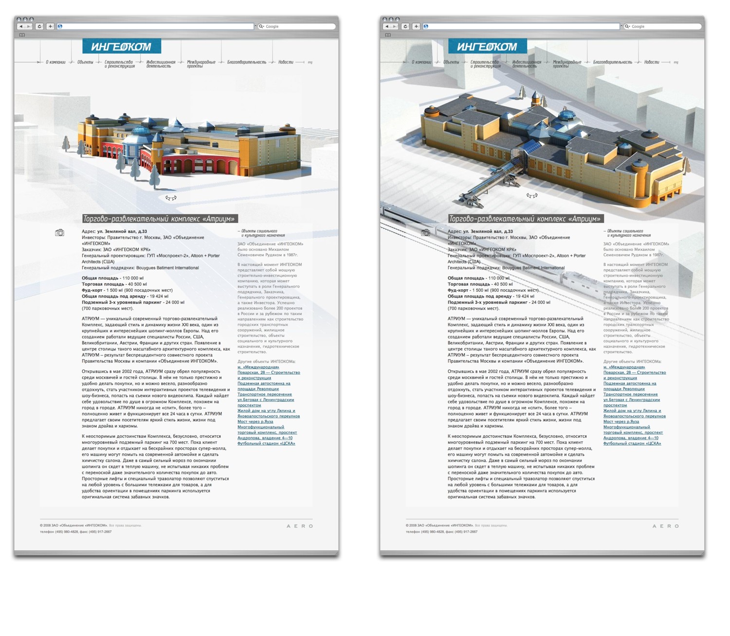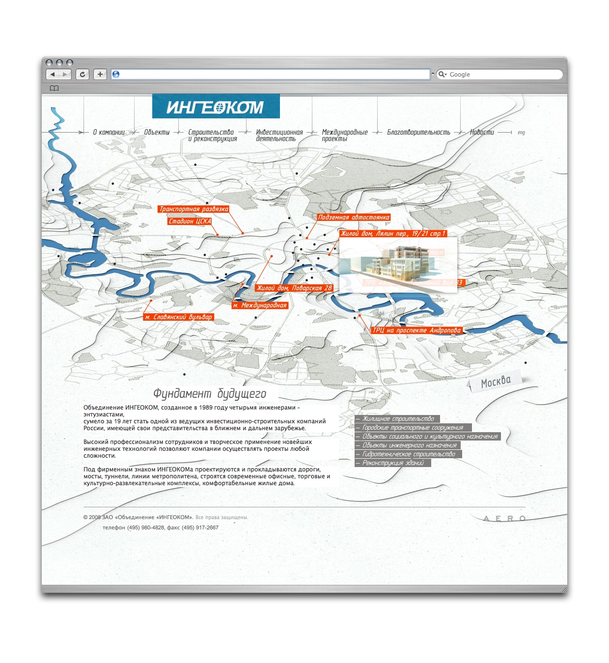 Агентство Aero разработало сайт для строительной компании "Ингеоком"В основу визуальной концепции сайта www.engeocom.ru заложена расположенная на главной странице трехмерная карта Москвы, выполненная в виде картонного макета, с размещенными на ней строительными объектами "Ингеоком". За счет применения дизайнерами Aero мощных 3D-технологий посетитель сайта имеет возможность увеличивать и крутить каждый из 10 основных объектов, рассматривая его с разных сторон. Данное решение реализовано посредством технологии Adobe Flash."Наше дизайнерское решение призвано заинтересовать посетителя сайта процессом его изучения, сделать его активным участником процесса получения информации. Кроме того, мощные современные технологии, использованные при разработке сайта, символизируют высокий уровень развития компании-заказчика", - прокомментировал генеральный директор Aero Владимир Синельников. Помимо карты Москвы и 3D-объектов моделей на сайте "Ингеоком" располагается информация о компании, ее строительной и инвестиционной деятельности, благотворительных программах и пр. |