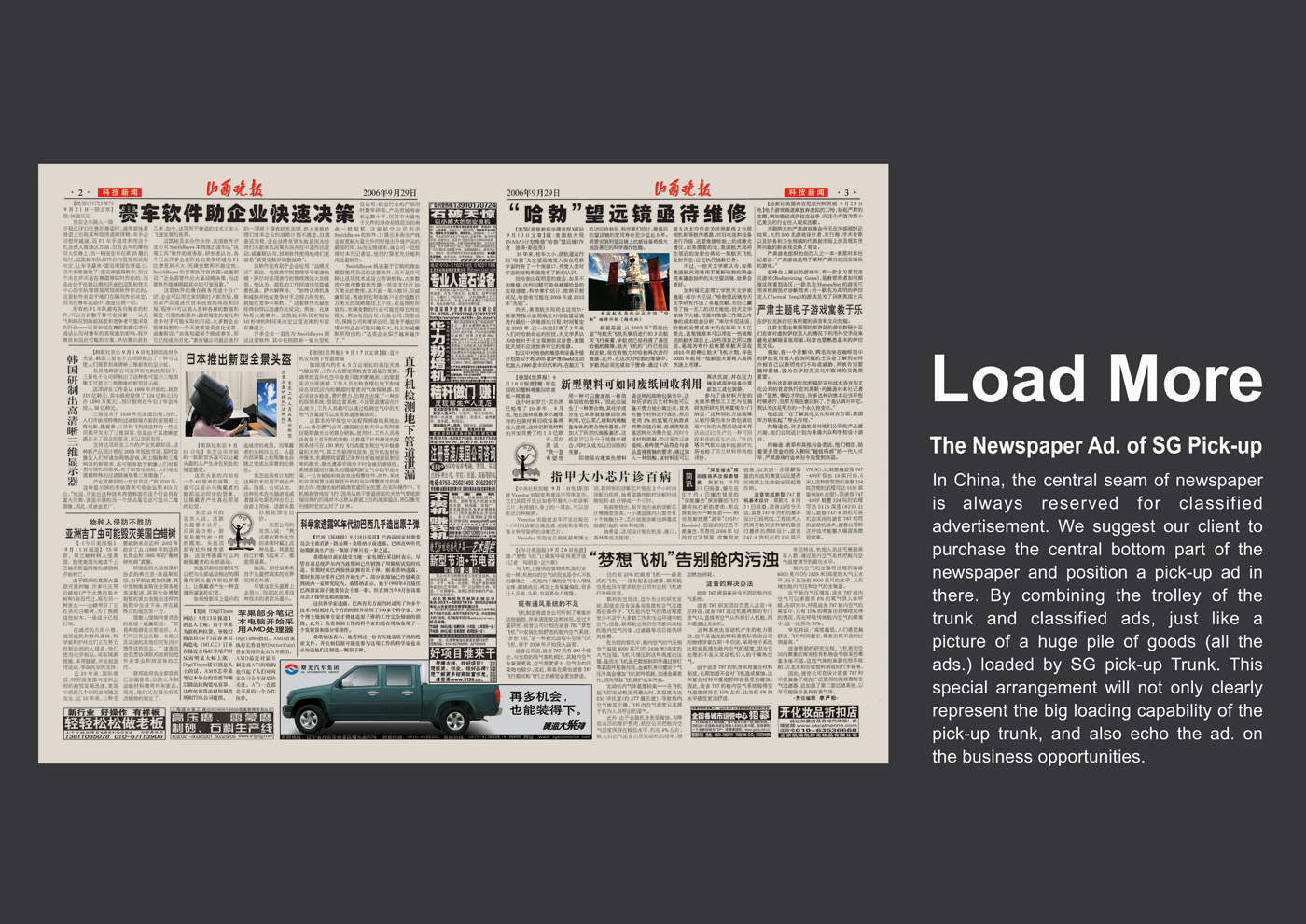 Пикап SG нагрузили рекламойВ китайских газетах центральную часть разворота принято отводить под рекламный блок, чем с успехом и воспользовалось агентство W&K Advertising, создавая рекламу для автомобилей от Liaoning SG Automotive Group. Поместив изображение пикапа SG под столбец с объявлениями, агентство показало, насколько вместителен этот автомобиль.Агентство: W&K Advertising, Пекин, Китай Творческий директор: Li Chen Арт-директор: Miao Qiu, Li Chen Копирайтер: Shen Lif |
