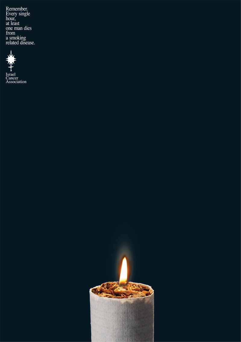 Заупокойные свечи в социалке Israel Cancer AssociationКак сообщает благотворительная израильская организация Israel Cancer Association, каждый час по крайней мере один человек в мире умирает от болезни, вызванной курением сигарет. В связи с этим рекламное агентство Gitam BBDO выстраивает следующий ассоциативный ряд: сигарета превращается в заупокойную свечу над могилой курильщика.Надпись: "Помни, каждый час по крайней мере один человек умирает от болезни, связанной с курением." Агентство: Gitam BBDO, Израиль Главный творческий директор: Guy Bar Творческий директор: Igal Hazan Фотограф: Yisrael Cohen |