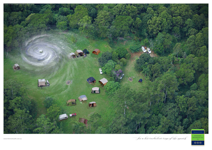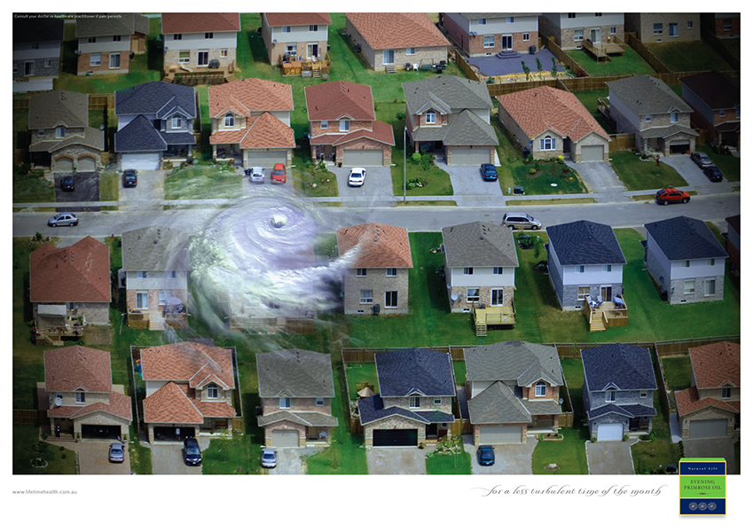 Когда женщина превращается в ураган, поможет Evening Primrose OilsВсе мужчины знают, что в некоторые дни месяца женщина может быть похожа на бушующий ураган. Но капсулы Evening Primrose Oils (Масло ослинника) от компании Lifetime Health помогут успокоить женский организм и вернут хорошее настроение, рассказывает австралийское агентство Ward 6 при помощи этой рекламной кампании. Кроме того, Evening Primrose Oils помогает при сердечно-сосудистых заболеваниях, дисгормональных состояниях как у женщин, так и у мужчин, улучшает зрение и омолаживает кожу.Агентство: Ward 6, Сидней, Австралия Творческий директор: Hugh Fitzhardinge, Grant Foster Арт директор: Richard Price, Grant Foster, hamish grieve Копирайтер: hamish grieve |