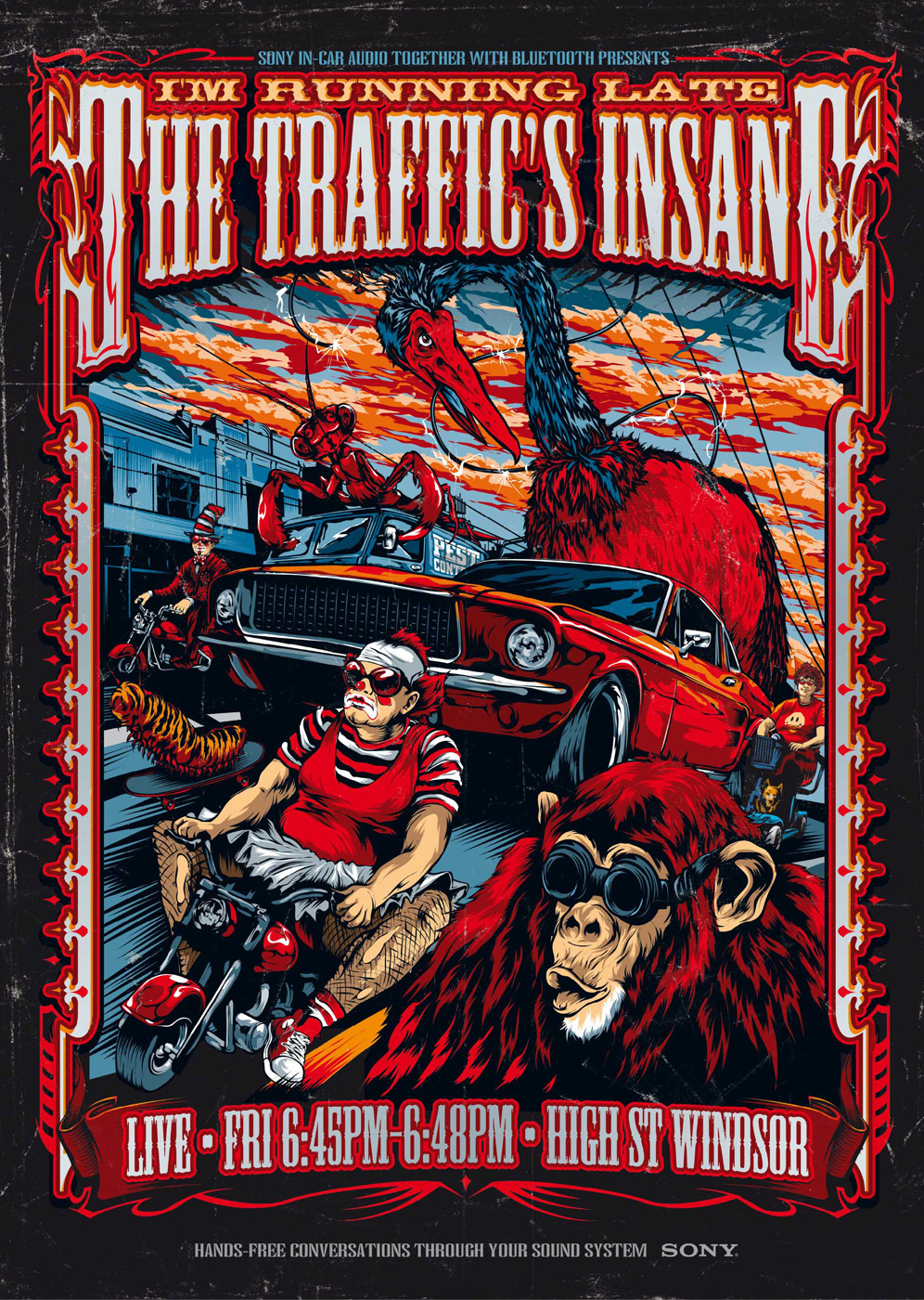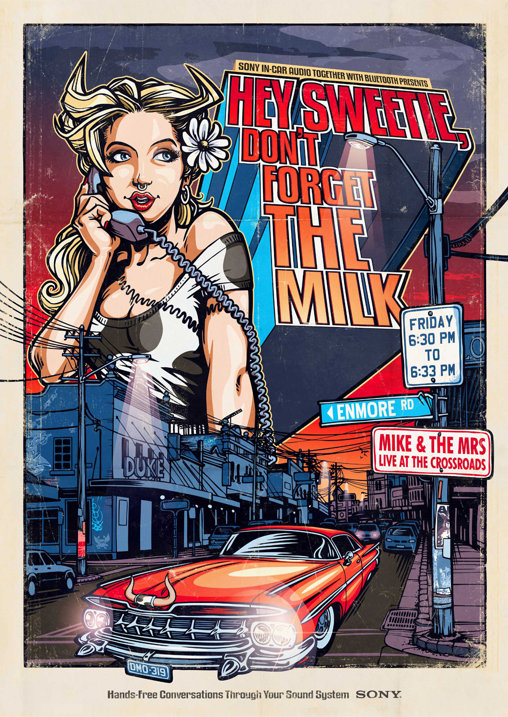 Сумасшедшие принты в рекламе Sony In-Car AudioКак сообщает австралийское агентство Saatchi & Saatchi, теперь новая музыкальная система Sony In-Car Audio с технологией Bluetooth позволяет подключать к ней свой сотовый телефон и общаться прямо через динамики автомобиля без каких либо дополнительных устройств."Я буду позже, движение ужасное. Привет, милый, не забудь про молоко. Я уже еду. Сбежал с работы пораньше" Агентство: Saatchi & Saatchi, Сидней, Австралия Главный творческий директор: Steve Back Арт директор: Vince Lagana/Steve Jackson Копирайтер: Steve Jackson/Vince Lagana Иллюстратор: Ken Taylor & Daymon Greulich |