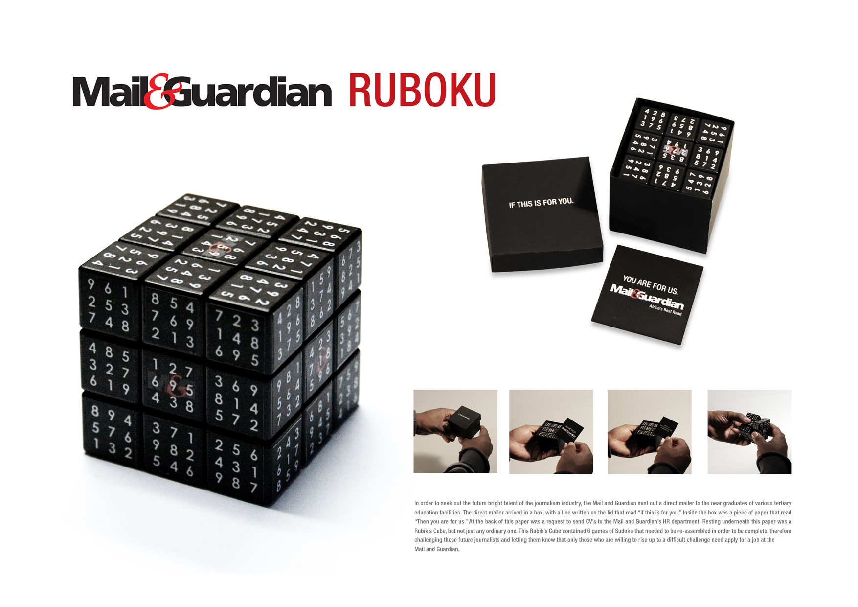 Новая головоломка "Рубоку" в рекрутинговой кампании газеты Mail & GuardianВ мире известно множество головоломок, в том числе судоку и Кубик Рубика. Южноафриканское агентство TBWA\Hunt\Lascaris решило объединить оба этих развлечения в одно так называемое "Рубоку", чтобы показать, что газете Mail & Guardian требуются действительно умные и находчивые сотрудники.Надпись: "Если это для тебя, то ты для нас. Mail & Guardian." Агентство: TBWA\Hunt\Lascaris, Йоханнесбург, ЮАР Главный творческий директор: Damon Stapleton Творческий директор: Adam Weber Арт директор: David Joubert Копирайтер: Lauren Shewitz |
