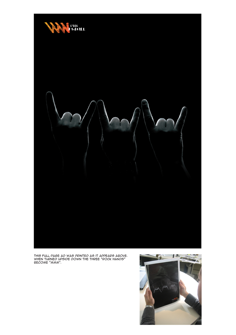 "Коза" в рекламе радио GPY&R MelbourneАвстралийское агентство GPY&R Melbourne выпустило этот рекламный принт для радио-станции Triple M, которая транслирует исключительно рок-музыку. На нем изображен фирменный жест в виде "козы" из двух пальцев, без которого сегодня не обходится ни один рок-концерт. А надпись сверху принта побуждает перевернуть изображение, получив тем самым логотип рекламируемой радио-станции.Агентство: GPY&R Melbourne, Австралия Фотограф: Mike Baker Главный творческий директор: Ben Coulson Главный арт-директор: Ben Couzens Главный копирайтер: Jim Ingram Арт-директор: Jason Ryan |