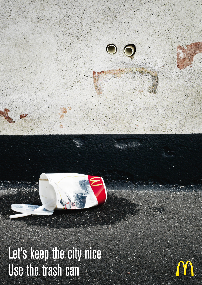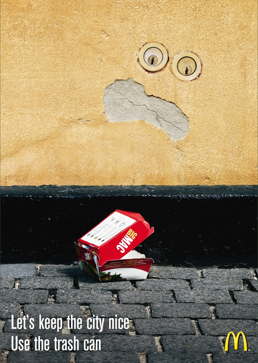 Злые стены. McDonald's борется со своим же мусоромMcDonald's и DDB Denmark проявляют недюжинную заботу о чистоте немецких городов. В июле появилась рекламная кампания «Let's keep the city nice. Use the trash can» («Давайте держать город в чистоте. Используйте урны для мусора»).Для пущего драматизма в рекламе использованы образы стен, недовольных мусором на улицах. Компания McDonald's даже не пожалела мусора собственного производства. Спорный момент – может быть, и не стоило переводить общий негатив на упаковки от своей же продукции, но есть в этом и что-то отчаянно благородное. Попытка DDB одушевить городское пространство предпринята, видимо, с целью урезонить людей не мусорить раз уж не ради себя, так хотя бы ради самого города. KAK.RU |