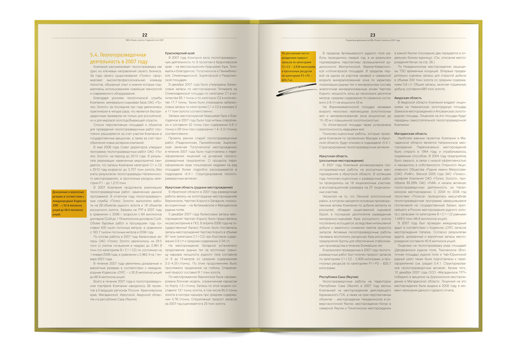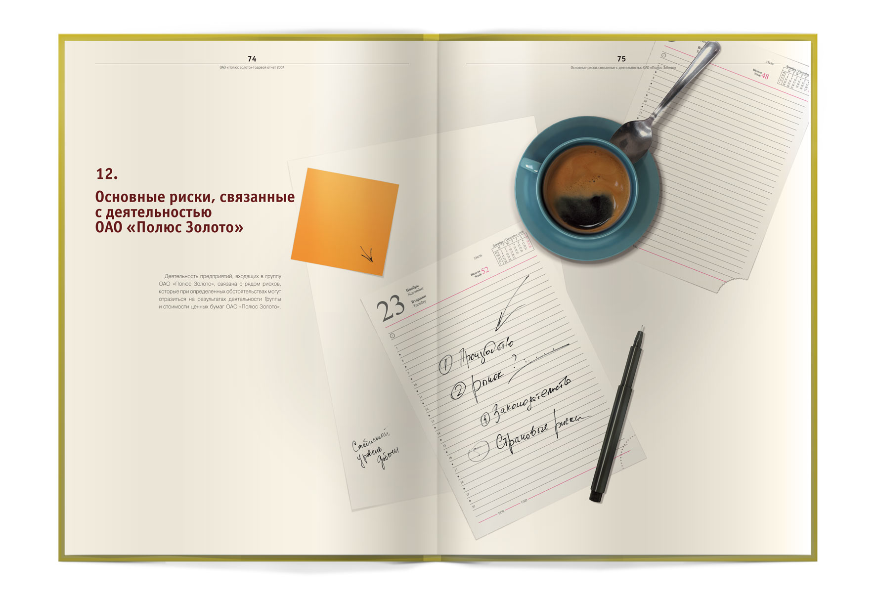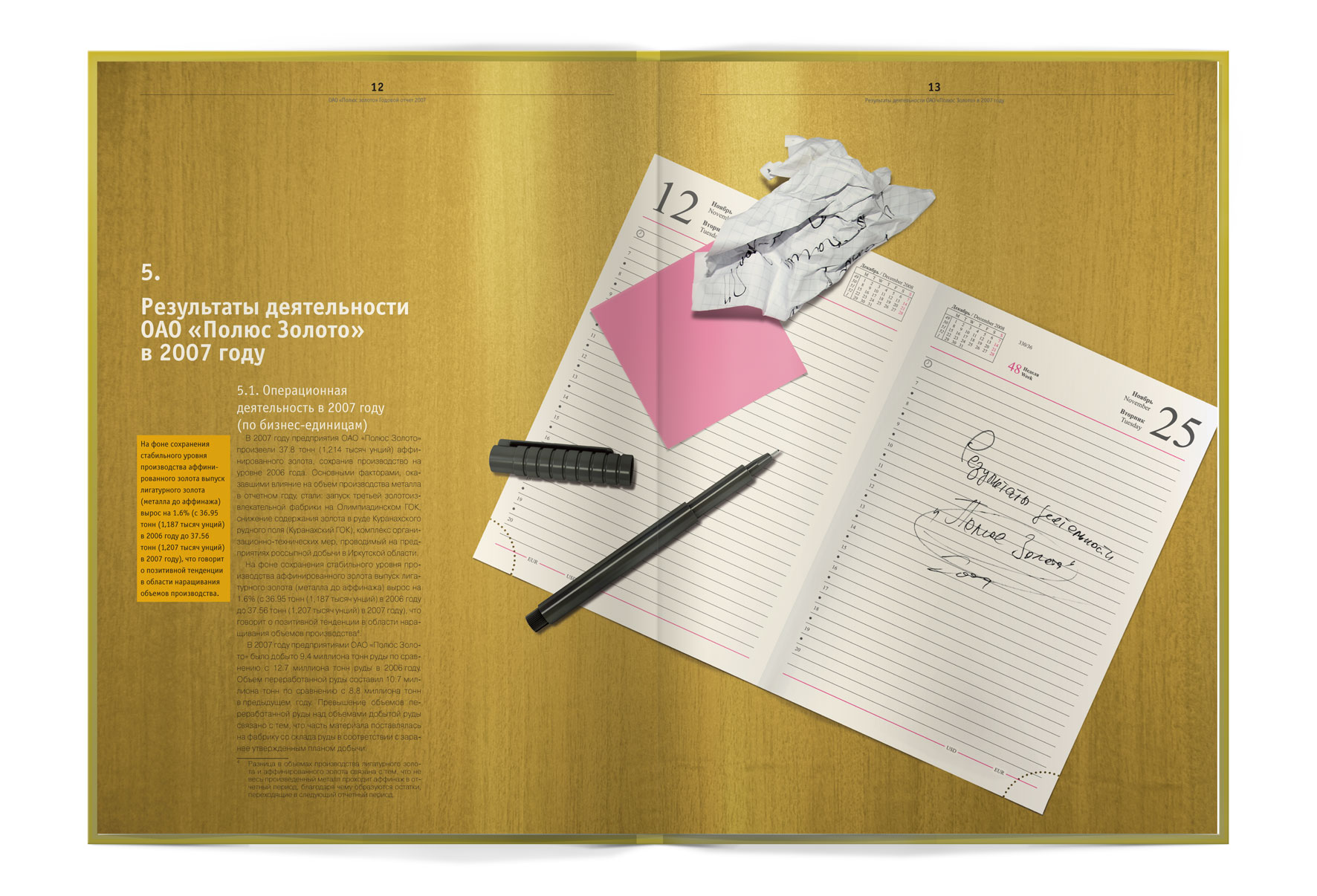 Золотом единым. "Полюс Золото" представила отчет за 2007 годБюро графического дизайна "Энди_ЗАЙН" завершило работу над Годовым отчетом за 2007 год крупнейшей золотодобывающей компании "Полюс Золото".Концептуальное решение при разработке дизайна годового отчета заключалось в создании ассоциации с ежедневником. Заголовки, написанные небрежным почерком, пометки на полях и стилизованные росчерки пера вызывают ощущение, что читатель имеет дело скорее с личным ежедневником золотодобытчика, нежели годовым отчетом крупной компании. Эта идея была поддержана и неординарным полиграфическим исполнением: жесткая обложка с кожаным переплетом и тиснением логотипа Оригинальные фотографии на шмуц-титулах, строгая верстка, использование золотого цвета в заголовках и графиках подчеркивает, по мнению авторов проекта, профиль золотодобывающей компании. Состав творческой группы: Арт-директор: Ольга Погорелова Руководитель проекта: Марина Аверьянова |