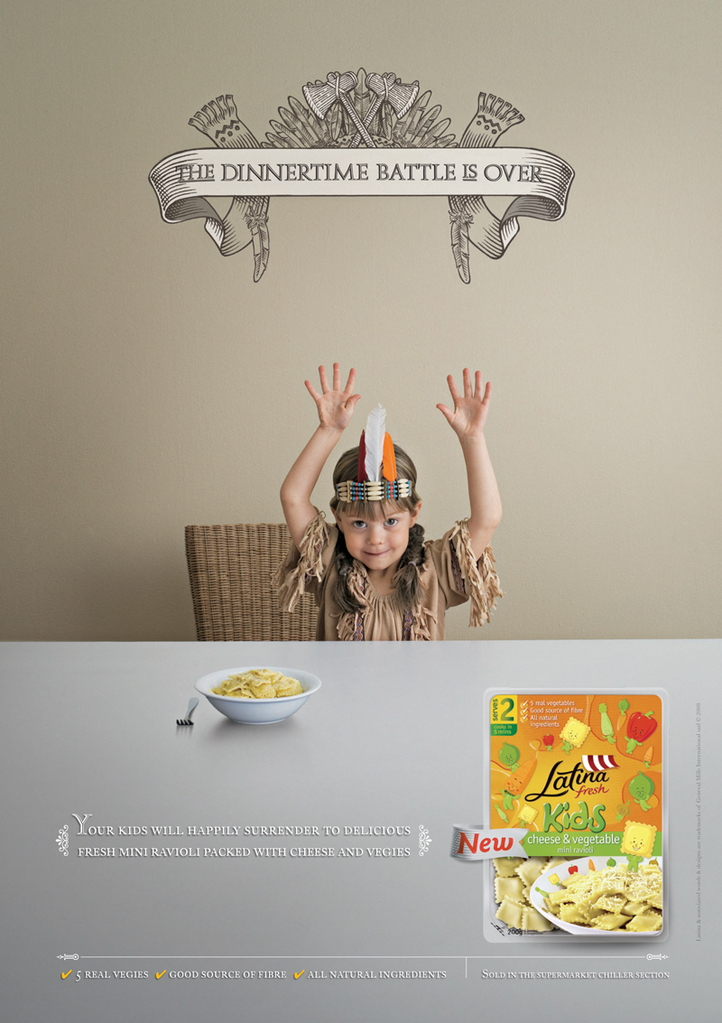 Обеденная битва в рекламе Latina Kids PastaИногда бывает так сложно уговорить своего ребенка на время прервать игры и нормально поесть, но австралийское рекламное агентство George Patterson Y&R нашло выход. Благодаря новым мини равиоли Latina Kids Pasta от General Mills вам удастся одержать быструю победу над маленьким пиратом, солдатом или даже индейцем.Надпись: "Обеденное сражение закончено." Агентство: George Patterson Y&R, Мельбурн, Австралия Фотограф: Paul Torcello Творческий директор: Ben Coulson Арт директор: Paul Meates & Donna Stevens Копирайтер: Vanilla Stener |