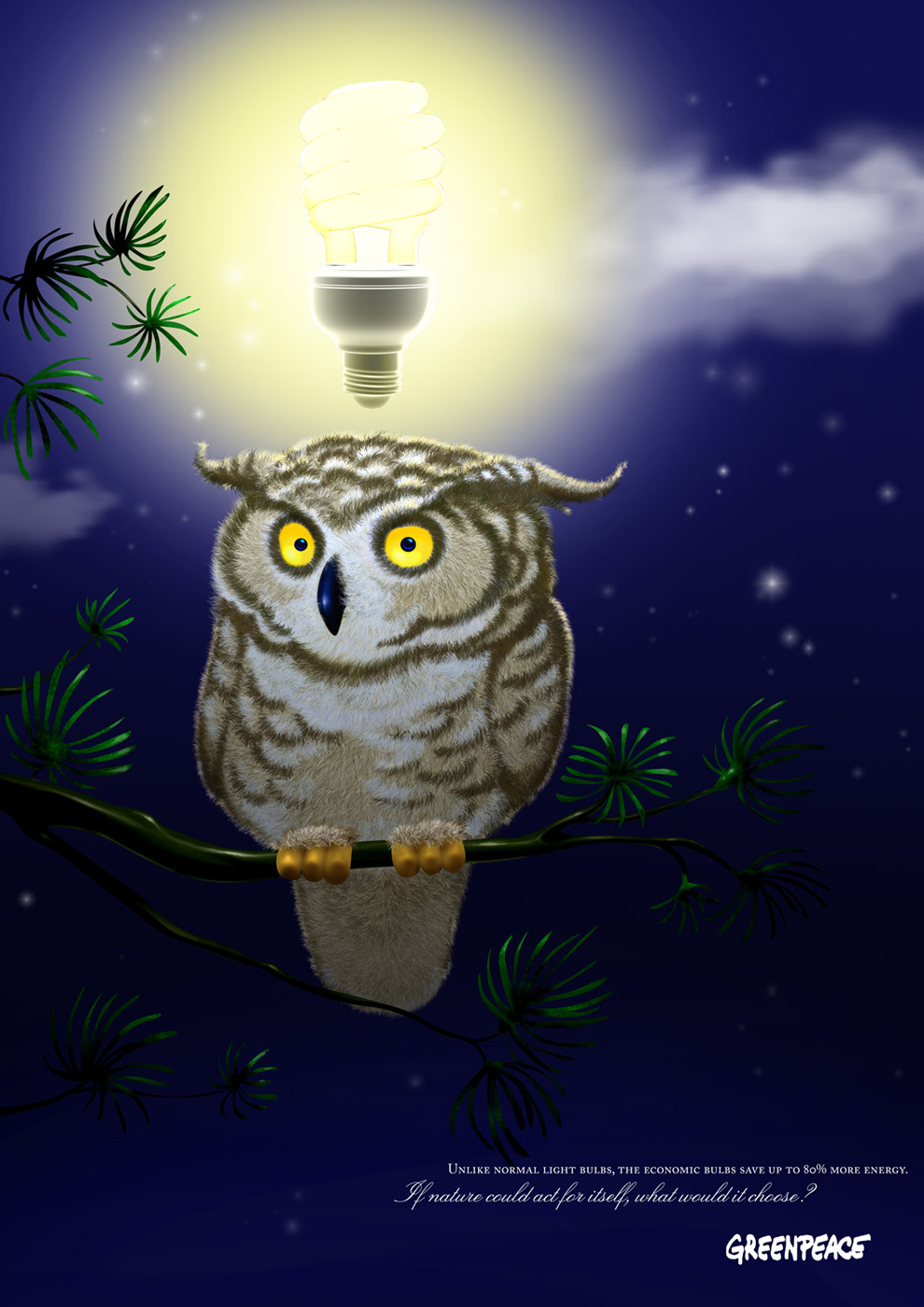Природа выбирает экономию электроэнергии, Greenpeace продолжает социальную кампаниюВ продолжение социальной кампании Greenpeace агентство Scala JWT выпустило серию принтов, на которых животным дан шанс самостоятельно выбрать между обычными электрическими лампочками и энергосберегающими.В отличие от обычных электрических лампочек, экономичные лампочки сберегают до 80% электроэнергии. Если бы природа могла сама выбирать, чтобы она выбрала? Агентство: Scala JWT Bucharest, Romania Иллюстратор: Alex Tamba Исполнительный креативный директор: Mihai Cojocaru Арт директор: Virgiliu Andone Копирайтер: Andreea Dragomir |
