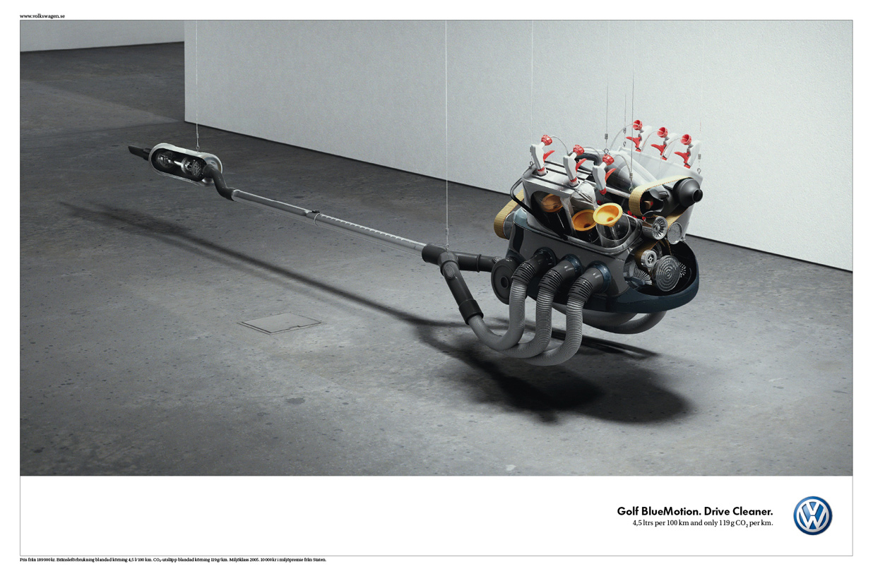 Golf BlueMotion - мотор-пылесосРекламная кампания автомобиля Golf BlueMotion от агентства DDB позиционирует автомобиль не только как один из самых экономичных в своем классе, но и как один из самых экологически чистых авто. Под капотом этого автомобиля установлен 1,9-литровый дизельный TDI двигатель, потребляющий не более 4,5 литров топлива на 100 км пробега. Уровень выброса СО2 у BlueMotion составляет всего 119 г/км. При мощности мотора в 103 л.с. и крутящем моменте в 250 Нм.Согласно пресс-релизу компании, на одном баке топлива (55 литров) BlueMotion может проехать 1200 км. Агентство: DDB Stockholm, Sweden Креативный директор: Johan Holmstr?m Арт директора: Viktor Arve, Ted Harry Mellstr?m, Simon Higby Копирайтер: Martin Lundgren Artwork: Louise Carlsson |