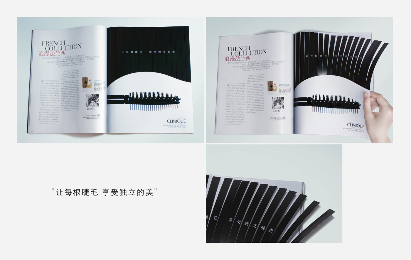Разрезанная журнальная страница рекламирует тушь CliniqueЧтобы показать преимущества специальной щеточки туши для ресниц Clinique, которая обеспечивает отсутствие комочков и непревзойденный объем, рекламное агентство WE Marketing Group предложило разрезать страницу в одном из модных журналов.Агентство: WE Marketing Group, Шанхай, Китай Творческий директор: Denerl Zhang Арт-директор: Linus Tang, Janny Guo Иллюстратор: Linus Tang |