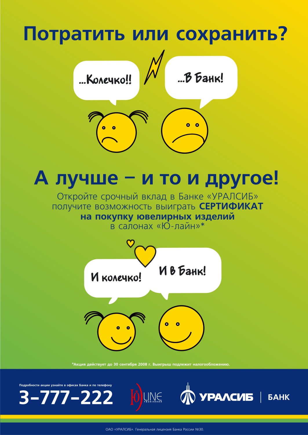 В августе стартовала акция по продвижению розничных услуг банка "УРАЛСИБ"Коммуникационная Группа компаний "МедиаПартнер" обеспечивает рекламное сопровождение проекта.Для усиления позиции банка "УралСиб" на розничном рынке была разработана акция, которая пройдет с августа по 30 сентября в трех уральских городах - Екатеринбурге, Каменск-Уральск и в Нижнем Тагиле. Концепт акции базируется на конфликте интересов в семье и его благополучном решение от "УРАЛСИБ". В тексте радиороликов обыгрывается узнаваемая ситуация: "лучшая половина" человечества хочет потратить деньги на колечко и сережки, мужчина - сохранить семейный бюджет в банке, а диктор от лица "УРАЛСИБ" предлагает лучший финал: открыв любой срочный вклад, увеличить сбережения, и вместе с тем выиграть сертификат на приобретение ювелирных украшений. В POSM-материалах яркая графика и лаконичный текст основного рекламного сообщения дополняются ключевыми фразами героев радиорекламы и изображениями персонажей ролика, стилизованными под легкую форму комикса. В качестве каналов коммуникации с целевой аудиторией задействованы радио, телевидение и реклама в местах продаж. По итогам кампании в эфире новостных ТВ-программ будет транслироваться церемония награждения победителей акции. |