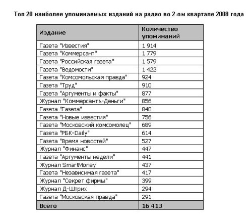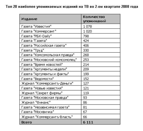 Компания TNS Россия представила результаты исследования цитируемости печатных изданий - газет и журналов - на федеральных российских телеканалах и московских радиостанциях во втором квартале 2008 года. Данная волна исследования проводилась в Москве в апреле - июне этого года и традиционно охватила специализированные теле- и радиопрограммы, посвящённые обзору прессы, а также новостные выпуски. Среди газет бесспорными лидерами на ТВ и радио стали "Известия" (1078 упоминаний на ТВ и 1914 - на радио) и "Коммерсант" (1020 упоминаний на ТВ и 1779 - на радио). Из журналов в эфире чаще всего упоминали "Коммерсантъ-Деньги" (127 раз на ТВ и 856 - на радио). Любопытно, что на радиостанциях о прессе в принципе говорили больше, чем на телеканалах. Сравните: радио - 14822 упоминания о газетах и 3631 - о журналах; телевидение - 5934 упоминания о газетах и 784 - о журналах.