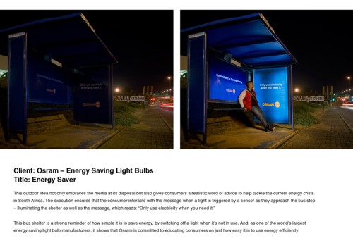 Автобусная остановка Osram призывает экономить электроэнергиюС каждым годом энергия становится все дороже и дороже, а ее запасы быстро истощаются, и поэтому, по мнению компании Osram, каждый человек просто обязан делать все, что только в его силах, чтобы сэкономить хоть каплю энергии. Например, включать свет только тогда, когда это действительно необходимо. Проиллюстрировать эту мысль взялось южноафриканское рекламное агентство Saatchi&Saatchi, создавшее автобусную остановку со встроенными сенсорами, реагирующими на движение человека.Используй электричество только тогда, когда тебе это нужно." Агентство: Saatchi&Saatchi, Кейптаун, ЮАР Творческий директор: Anton Crone Арт-директор: Gareth Cohen Копирайтер: Rolf Fitschen |