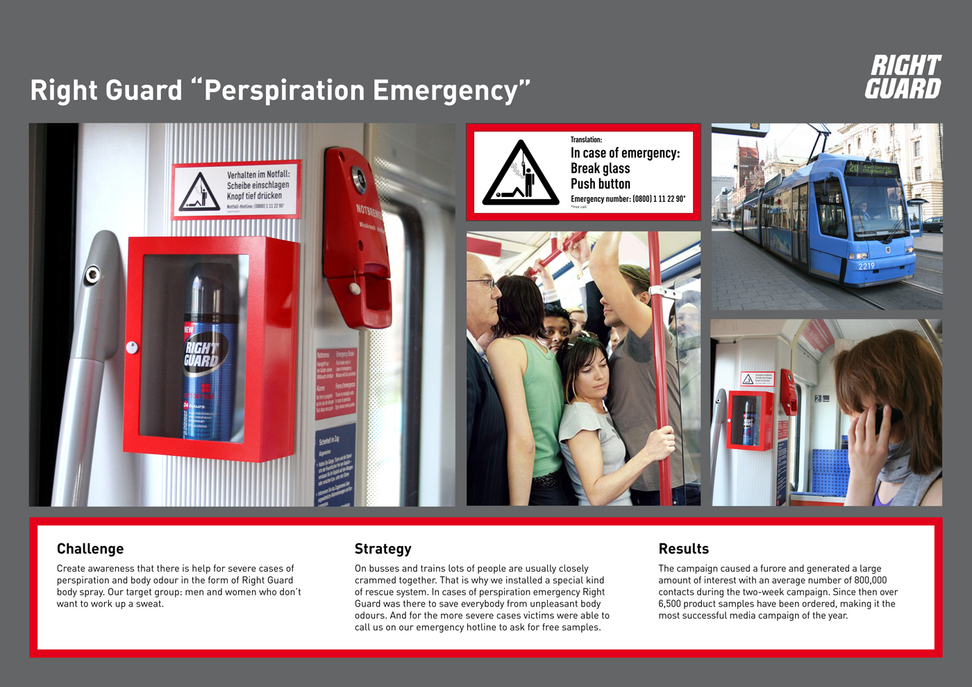 Дезодорант Right Guard - для экстренных случаевНемецкое агентство DDB Germany разработало интересную рекламную акцию для дезодоранта антиперспиранта Right Guard: в общественном транспорте была установлена необычная "спасательная система". Она заключала в себе баллончик Right Guard, способный прийти на помощь в тех случаях, когда больше нет возможности терпеть неприятный запах.В случае необходимости: разбить стекло, нажать на кнопку. Агентство: DDB Germany, Дюссельдорф, Германия Творческий директор: Heiko Freyland, Alexander Reiss Арт-директор: Michael Kittel Копирайтер: Jan Propach |