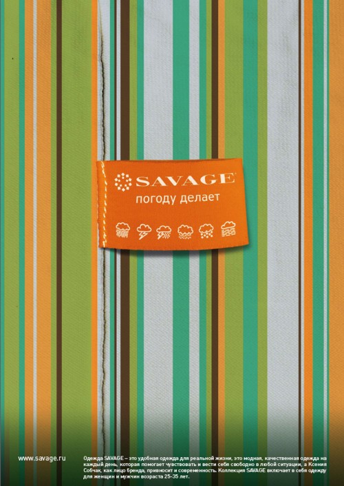 Savage и Ксения Собчак двигают антициклонВ преддверии нового сезона осень-зима 2008/2009 сеть магазинов одежды Savage запускает рекламную кампанию с Ксенией Собчак в главной роли, разработанную рекламным агентством McCann Erickson . Два ролика "VIP заказ", отличающихся друг от друга лишь "сезонной" концовкой, вышли в эфир федеральных каналов НТВ, ТНТ, ТВЦ 25 августа. Ролик будет поддержан наружной кампанией в России, на Украине и в Казахстане. Слоган новой рекламной кампании - "Savage погоду делает!". На самом деле, погоду в этих спотах делает сама Собчак. В честь покупки нового анорака от рекламируемого бренда эта девушка при помощи звонка нужным людям может и антициклон передвинуть в нужное место.Как ранее писал Sostav.ru, Ксения Собчак - весьма востребованная на российском рекламном рынке медиаперсона. В настоящее время она также успела прорекламировать своим именем подростковую косметику MIA в рекламном ролике от агентства TWIGA TOUCH. Кроме того не так давно звезду отечественного телевидения в роли лошадки можно было увидеть в предолимпийской рекламе от телеканала ТНТ. Состав творческой группы: Бренд: Savage Клиент: Savage Руководитель отдела рекламы и PR Savage Иван Дьяченко Агентство: McCann Erickson Генеральный директор: Евгения Мур Арт-Директор Юрий Пакуев Creative Group Head Анастасия Вучетич Копирайтер: Марина Дедюкина Руководитель группы по работе с клиентами: Андрей Михальченко Account Director Алла Максимович Account Executive Евгения Буланова Продюсер агентства:Татьяна Дмитриева Продакшн: Just Production Генеральный Продюсер: Анна Медведева Продюсер продакшн хауса: Антон Замахин Режиссер: Андро Окромчедлишвили Оператор: Максим Осадчий