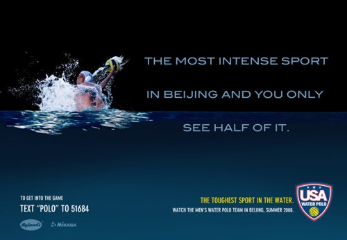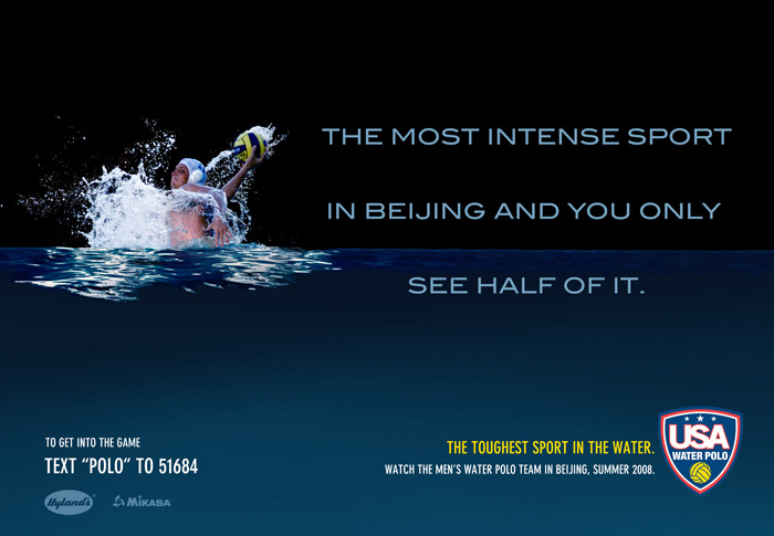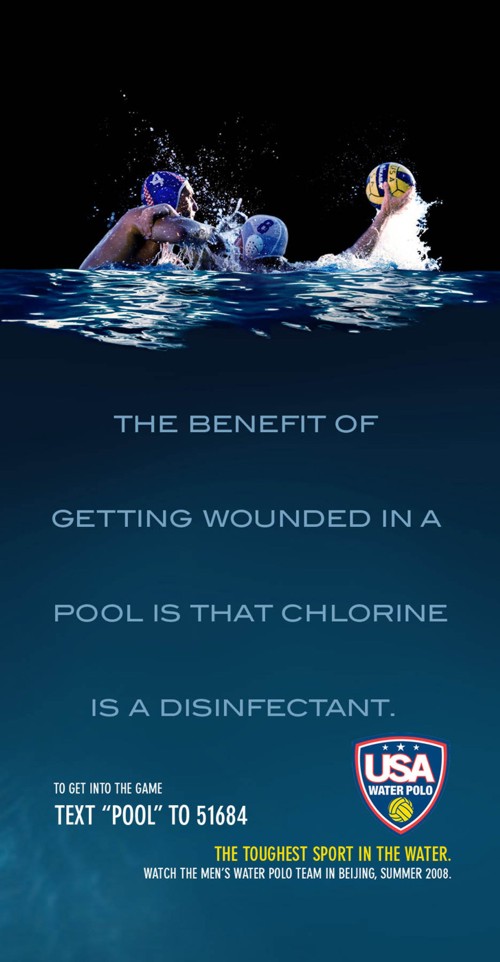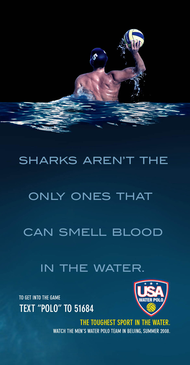 USA Water Polo: в водное поло играют настоящие мужчиныПо мнению американского рекламного агентства Kinetic, такой командный вид спорта с мячом, как водное поло - это очень серьезная, напряженная и зрелищная игра. А когда в ней участвуют американцы из ассоциации USA Water Polo, то игра превращается в настоящую битву.Самый напряженный спорт в Пекине и вы видите только его половину. Не только акулы могут чувствовать кровь в воде. Преимущество быть раненным в бассейне состоит в том, что хлорка - дезинфицирующее средство. Агентство: Kinetic, США |