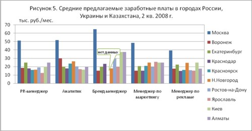 Вполне ожидаемы значительные расхождения в уровне оплаты труда специалистов между Москвой и регионами России. Заработные платы некоторых специалистов в Москве и других городах России могут отличаться в 3-4 раза. Наибольшие межрегиональные различия в уровне оплаты труда у директоров по маркетингу и бренд – менеджеров, то есть у самых высокооплачиваемых специалистов в маркетинге. Таблица 1. Средние предлагаемые заработные платы (руб./мес.), 2 кв. 2008 г.