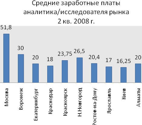 Обзор рынка труда в сфере маркетингаОбзор подготовлен исследовательским центром группы компаний HeadHunter на основе размещенных на сайте hh.ru вакансий компаний-работодателей и резюме соискателей. Большой объем информации (более 89 200 вакансий и 2 100 000 резюме), содержащийся в базе, позволяет получать репрезентативные данные. Анализировались данные за 2 квартал 2008 года. 1. Спрос на маркетинговых специалистов.Специалисты из области «Маркетинг/Реклама/PR» на сегодняшний день являются одними из самых востребованных специалистов на рынке труда.[1] По версии сайта hh.ru область «Маркетинг/Реклама/PR» входит в Топ-5 профессиональных областей, в которых наблюдается наибольший спрос на специалистов на рынке труда Москвы. Наиболее востребованные специалисты, как в Москве, так и в других городах России - это менеджеры по маркетингу - специалисты, выполняющий широкий круг задач. Ольга Кочкина, директор представительства HeadHunter в Ярославле: «Исходя из данных исследования можно говорить , что в Ярославле в сфере маркетинга востребованы специалисты синкретичные – менеджеры по маркетингу – в чей функционал входят PR, анализ рынка и рекламная деятельность. Узконаправленные специалисты востребованы гораздо менее – аналитики, PR- менеджеры – по этим позициям количество резюме превосходит количество вакансий в разы. Количество вакансий превышает количество резюме только по двум позициям – бренд-менеджер и менеджер по рекламе. Бренд-менеджеры востребованы в крупных компаниях, продвигающих на рынке те или иные торговые марки.»Примечание: исследованы наиболее востребованные в области маркетинга/PR специальности. Кроме менеджеров по маркетингу в Москве и Краснодаре в середине 2008 года были востребованы специалисты по анализу и исследованию рынков (см. рис. 1). Число вакансий аналитиков и исследователей было примерно в 1,5 раза больше, чем число вакансий менеджеров по рекламе, занимающих третье место по числу вакансий в проф. области «Маркетинг/Реклама/PR». В Ростове-на-Дону, Воронеже, Ярославле на втором месте по спросу среди специалистов по маркетингу были менеджеры по рекламе, в Казахстане – бренд - менеджеры. В Нижнем Новгороде спрос на менеджеров по рекламе и на аналитиков/исследователей рынка был примерно одинаков. Если сравнивать с аналогичным периодом предыдущего года, набольший рост спроса в Москве был на pr – менеджеров и менеджеров по рекламе. Количество вакансий на эти позиции увеличилось на 40-50%. 2. Соотношение спроса и предложенияПо сравнению с началом 2007 года, дефицит специалистов в области маркетинга увеличился. Среди маркетинговых специалистов наиболее дефицитными являются аналитики. Также наблюдается дефицит менеджеров по маркетингу и бренд - менеджеров.[2] 3. Заработные платы специалистов в области «Маркетинг/Реклама/PR». Наиболее высокие заработные платы из специалистов в области маркетинга (если не брать во внимание руководящие позиции) у бренд - менеджеров. Ольга Бруковская, директор по маркетингу и PR группы компаний HeadHunter: «В сфере маркетинга зарплаты растут очень быстро. Связано это как с востребованностью Профессионалов с большой буквы в этой области, так и с пресловутой "перегретостью" рынка. Несмотря на то, что ВУЗы в последнее время выпускают много специалистов в сфере маркетинга, и профессия очень популярна, найти квалифицир