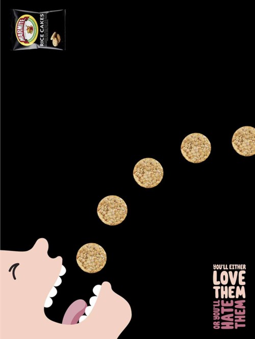 Любовь и ненависть в рекламе MarmiteMarmite - это солоноватая темно-коричневая паста с большим содержанием витамина Д, имеющая специфический вкус, который либо нравится, либо нет - третьего не дано! А Marmite Rice Crackers или Marmite Breadsticks - это соответственно рисовые крекеры и хлебные палочки со вкусом Marmite, которые также можно или любить, или ненавидеть, рассказывает английское агентство DDB London с помощью этих принтов.Ты или полюбишь Marmite, или возненавидишь. Агентство: DDB London, Соединенное Королевство Иллюстратор: Al Murphy Фотограф: Andy Grimshaw Главный творческий директор: Jeremy Craigen Главный арт-директор: Grant Parker Копирайтер / Арт-директор: NOAH REGAN, Graeme Hall |