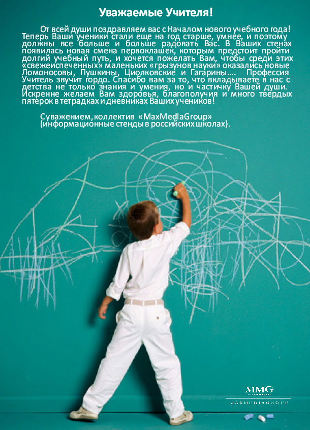 Поздравления с 1 сентября разместили как рекламу1 сентября коллектив агентства МaxMediaGroup разместил поздравительные плакаты «С 1 сентября !» в более чем 500 учебных заведениях московского региона на собственных рекламно-информационных стендах Infoboard.