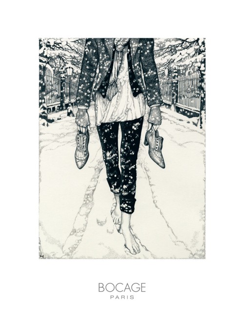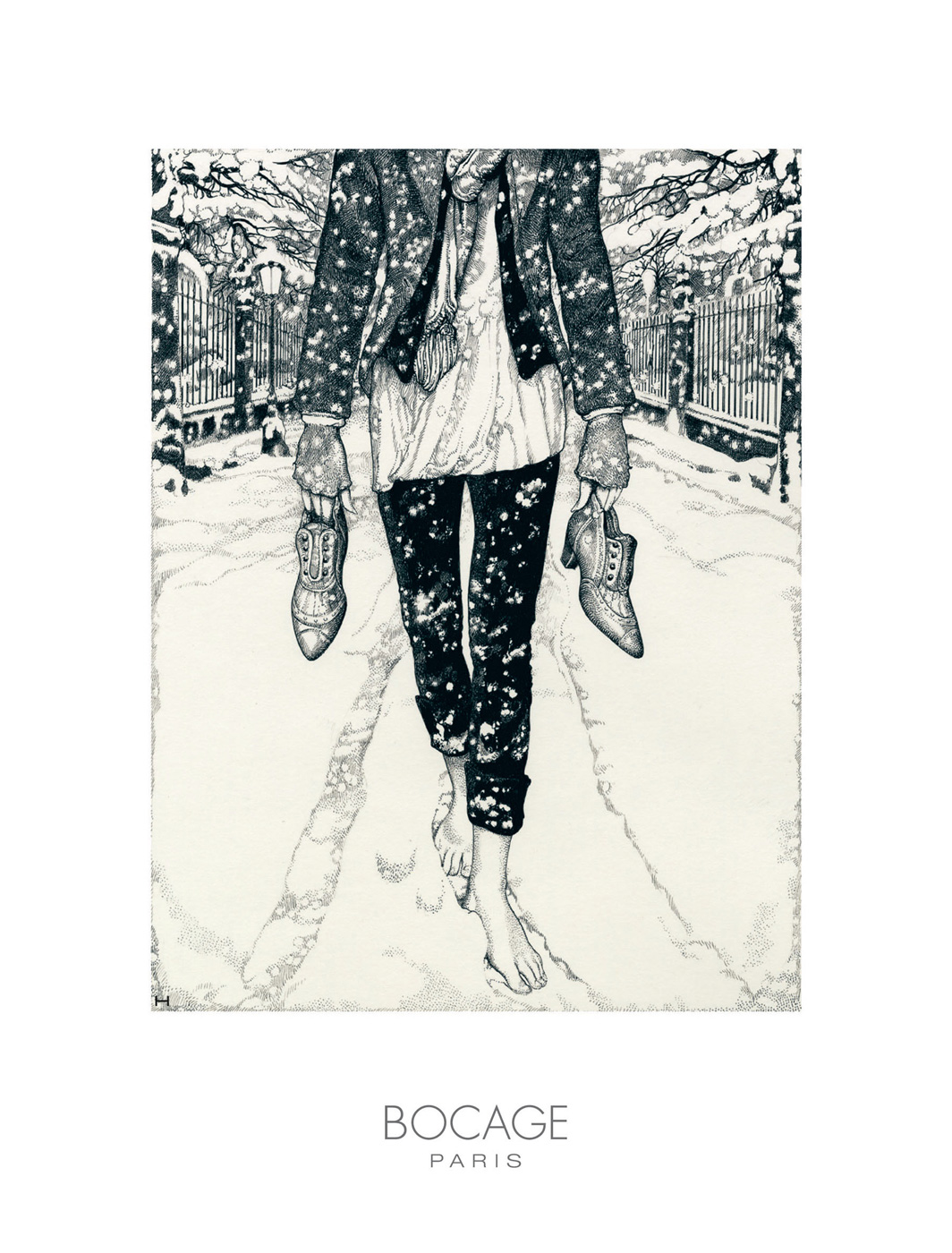 Bocage - обувь, которой вы дорожитеМужчина и женщина, не взирая на ужасную погоду, сняли с себя обувь Bocage и несут ее в руках, своим необычным жестом как бы говоря зрителю об исключительном качестве этой самое обуви. Если вы купили туфли Bocage, вы будете ими дорожить, будьте уверены.Агентство: H, Paris, France Креативный директор: Eric Galmard Арт директор: Philippe Rachel Иллюстратор: Vania Zouravliov |