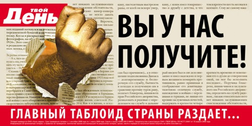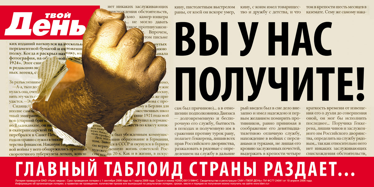 Реклама, которая бьет по зубам"Твой День" разыгрывает килограмм золота"Рекламные снайперы" разработали новую рекламную кампанию для одного из изданий "Ньюс Медиа Рус" - газеты "Твой День". Кампания призвана стимулировать потребительский спрос за счет анонсирования проведения лотереи под слоганом "Купи газету "Твой День" и выиграй килограмм золота". Основной посыл новой рекламы: "Вы у нас получите! Главный таблоид страны раздает…". Бюджет кампании составил 5 миллионов долларов. Для исполнения ролика, из Донецка был приглашен Сергей Сивоха, который вписался в роль гигантской золотой феи. Валерий Магдьяш подыграл ему в качестве счастливого обладателя главного приза. Золотая лихорадка на экране будет поддерживаться наружной рекламной кампанией в Москве и Санкт - Петербурге. С 1 сентября появятся "агрессивно-интригующие" щиты и стикеры в метро из первой волны кампании. Продолжение планируется на середину сентября. Состав творческой группы: "Рекламные снайперы" (ex-Nevolin) Идея, копирайт, арт-дирекшен, сценарий ролика - Марина Башмакова, Роман Мамаев Дизайн - компания mimi: Продакшен: Режиссер - Георгий Таидзе Композитор - Соколов Александр Оператор - Ермоленко Евгений Продюсер - Непомнящий Евгений |