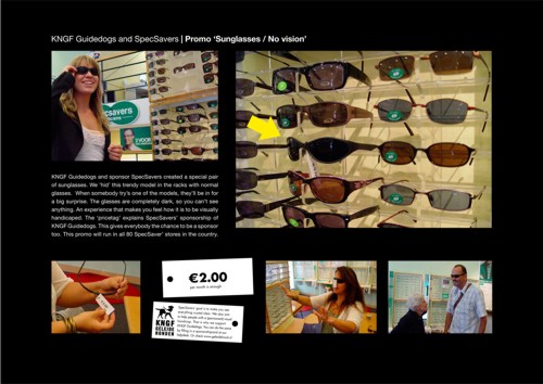 В сетевых магазинах оптики SpecSaver на стойки с солнечными очками была добавлена особенная пара. В одну из самых трендовых моделей были вставлены абсолютно непрозрачные стекла. UbachsWisbrun JWT хотели продемонстрировать, как чувствуют себя незрячие люди. Этикетка на очках гласит: «2 евро в месяц – достаточно».