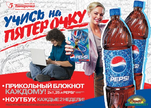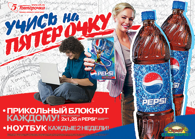 Постер для рекламной акции "Пепси"Агентство "МобиМарк" реализовало рекламную кампанию для ООО "ПепсиКо Холдингс" в сети магазинов "Пятерочка" на территории республики Башкортостан.Главный приз акции - ноутбук. Для принятия участия в розыгрыше ноутбука необходимо приобрести в любом из магазинов "Пятерочка" 2 бутылки Пепси и/или Пепси Лайт и/или Пепси Макс 1.25л в специальной упаковке. "Акция носит локальный характер, но часто именно в таких акциях получается очень высокий отклик. Иногда он достигает 30%", - комментирует Ира Попова, управляющий директор агентства мобильного маркетинга МобиМарк. |