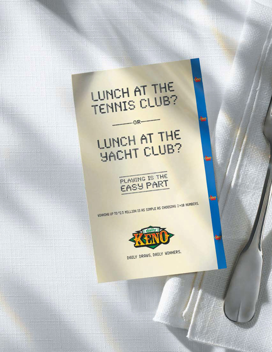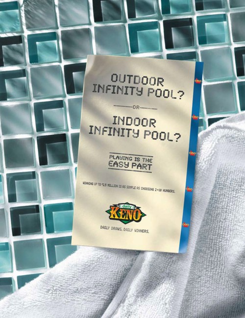 Измени жизнь, играя в лотереюНикогда не задумывались о том, что в кармане вместо клочка бумаги, возможно, уже лежит огромный плазменный телевизор или набор клюшек для гольфа? Агентство Bensimon Byrne предлагает вообразить себе такой поворот событий, прорекламировав два вида лотерейных билетов Daily Keno и Pick 4, которые выпускаются корпорацией Ontario Lottery and Gaming Corporation (OLG). Эта корпорация пришла на канадский рынок азартных игр 32 года назад и владеет на сегодняшний день несколькими казино и сетью игровых автоматов в провинции Онтарио.Теглайн: "У вас с собой билет, который выиграет сегодня?" "Обед в теннисном клубе или обед в яхт-клубе? Игра - это самая простая часть." "Бесконечный бассейн снаружи или внутри? Игра - это самая простая часть." Агентство: Bensimon Byrne, Торонто, Канада Творческий директор: David Rosenberg Арт директор: JP Gravina Копирайтер: Linsey Stewart Фотограф: Philip Rostron |