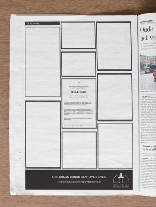 1 смерть равна 8 жизнямОригинальную печатную рекламную кампанию реализовало бельгийское рекламное агентство Duval Guillaume Brussels, опубликовав в журнале страницу с девятью некрологами. Вот только восемь из них остались пустыми, ведь один погибший человек спас восемь других жизней, пожертвовав свои органы. А все, что для этого требуется, - это зарегистрироваться на сайте "Re-born to be alive" в качестве донора.Агентство: Duval Guillaume Brussels, Бельгия Творческий директор: Katrien Bottez, Peter Ampe Арт-директор: yigit unan Копирайтер: Robin Stam ![]() |