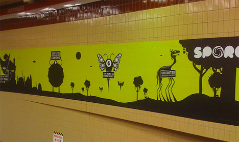 Споры. Рекламные работы американца Дрю МаршаллаSpore – это то ли новомодная сетевая игра, то ли какое-то коммьюнити по интересам, важно другое: стены домов, переходы метро и всяческие рекламные поверхности Нью-Йорка, Бостона и Сан-Франциско нынче покрыты основательно мутированными персонажами этого мира.