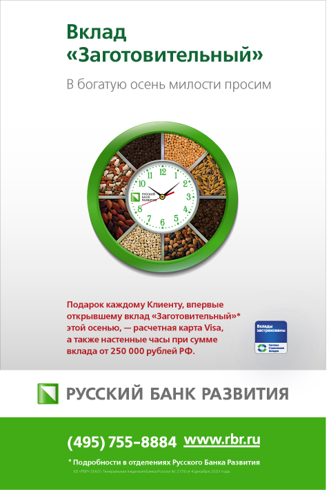 Русский Банк Развития готовится к зимеПришла осень, скоро наступят холода, так что самое время заняться запасами на зиму."Мы всегда стремились дарить нашим клиентам не просто красивые сувениры, но по-настоящему полезные и нужные подарки, которые по смыслу перекликались бы с названием вклада, - говорит Наталия Ковшель, заместитель начальника Департамента коммуникационного маркетинга Русского Банка Развития. - Так в прошлом году мы дарили клиентам баночку ягодного конфитюра и тостер, ведь осень - это время богатого урожая и вкусного варенья. В этом году мы решили подарить часы, которые напомнят своим хозяевам, что урожай нужно не просто собрать, но сохранить и приумножить". Кроме того, каждый кто, впервые откроет вклад "Заготовительный" получит от Русского Банка Развития расчетную карту Visa моментального выпуска, которая объединяет возможности вклада и преимущества банковской карты. Карта может быть оформлена как на имя вкладчика, так и на имя того, кому владелец вклада захочет ее подарить. Состав творческой группы: Команда Русского Банка Развития: Наталия Ковшель - куратор проекта Екатерина Морозова, Екатерина Ракчеева - менеджеры проекта Визуализация идеи - РА "New Channel": Мария Путова - эккаунт - директор Александра Роскина - дизайнер ![]() ![]() |