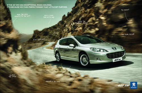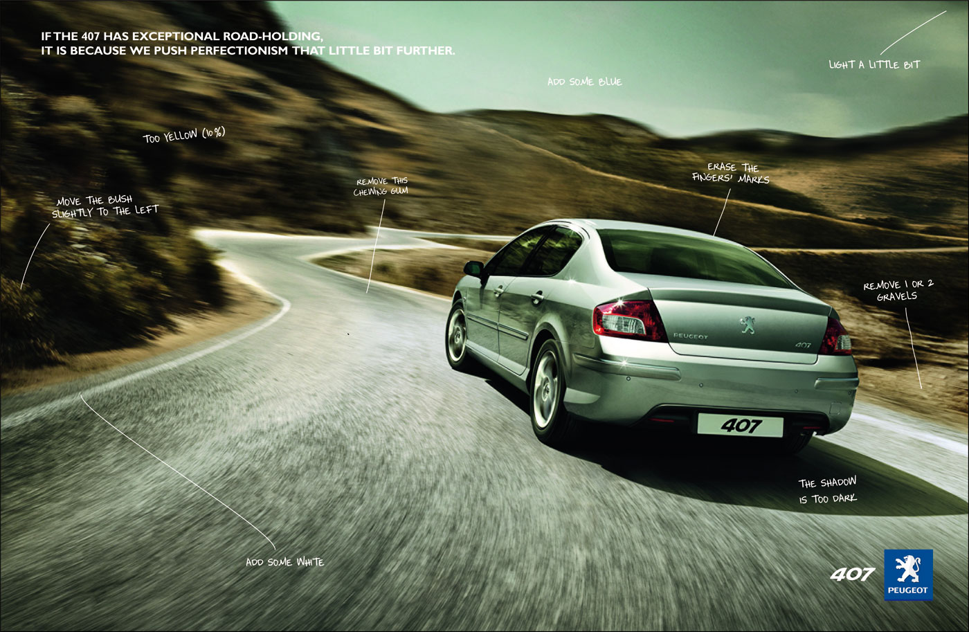 Идеальное не требует ретушиПрактически каждое фото, которое в будущем становится рекламой, подвергается ретуши, но это касается только неидеальных моментов. Так, например, в агентстве Ogilvy приняли решение отредактировать все за исключением самого продукта, а в французском агентстве Betc обратили внимание на необходимость серьезной ретуши рекламных принтов: нужно подкрасить дорожную разметку, высветлить тень, убрать лишний камешек, добавить облако, а также стереть отпечатки пальцев с Peugeot 407…