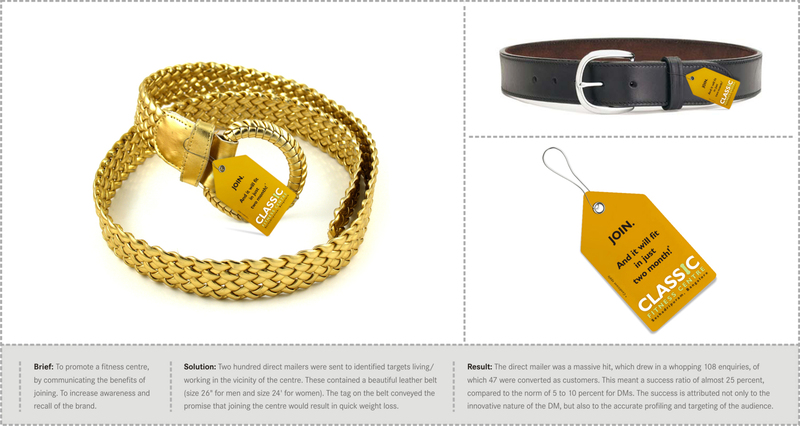 Bhadra Communications рассылает ремни по почтеИндийское рекламное агенство Bhadra Communications, однажды уже создав для фитнес центра Classic Fitness Centre рекламный принт с ремнем, решила не отдаляться от выбранной темы. Следующим шагом к привлечению клиентов стал директ-мейл: модные ремни двух размеров (для женщин Теглайн: «Присоединяйтесь! И через 2 месяца он вам подойдет!» Агентство: Bhadra Communications, Бангалор, Индия |