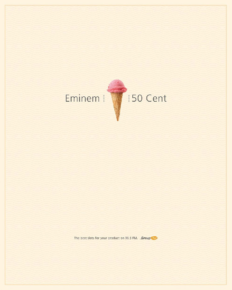 Group Plus впихнет мороженое между Eminem и 50 centС помощью этой серии рекламных принтов агентство Wunderman рассказывает, что компания Group Plus подберет для любого товара лучшее рекламное время в эфире арабских радиостанций.Group Plus является одной из крупнейших компаний по размещению рекламы на Ближнем Востоке. Она ведет бизнес в таких странах как Сирия, Ливан, ОАЭ, Саудовская Аравия и Бахрейн. В последней стране Group Plus принадлежат эксклюзивные права на трансляцию рекламы в эфире сразу трех радиостанций (93,3 FM, 96.5 FM и 102.3 FM), которые вещают как на английском, так и на арабском языках. В эфире этих популярных в Бахрейне станций можно услышать известные мировые хиты, арабскую музыку, последние новости, а так же различного рода шоу. Теглайн: "Лучшее место для вашей продукции на 96.5FM." Агентство: Wunderman, Дубай, ОАЭ |