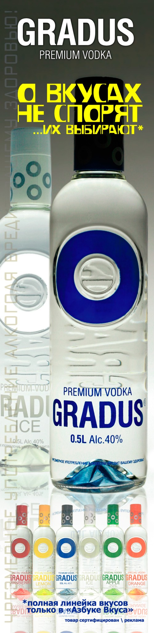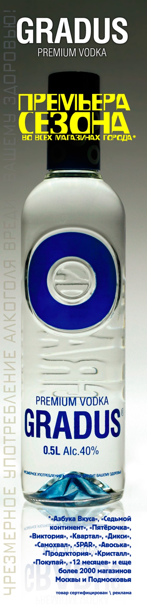 Российские журналы выйдут с "Градусом"Агентство маркетинговых коммуникаций "Пасифик Медиа", входящее в группу рекламных агентств PMCG, выиграло тендер на размещение в прессе макета ТМ "GRADUS".С сентября по декабрь 2008 года на страницах популярных журналов Москвы будут размещены макеты водки "GRADUS". Макеты можно будет увидеть в таких изданиях как "Семь Дней", "Афиша", "За Рулем", "Антенна", "Футбол" и пр. Особенностью данной рекламной кампанией является размещение двух макетов в каждом запланированном издании одновременно.