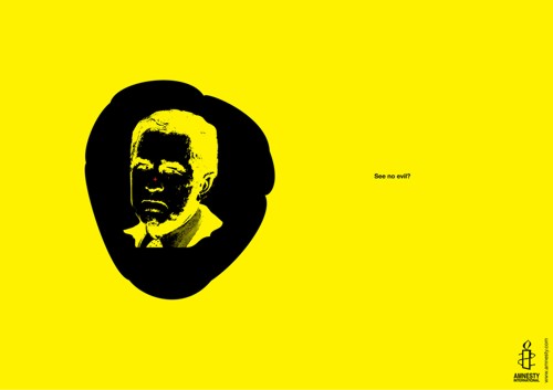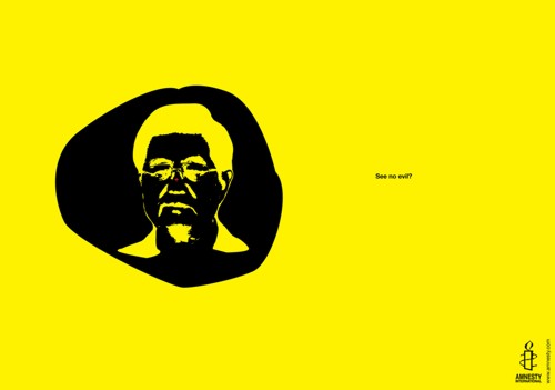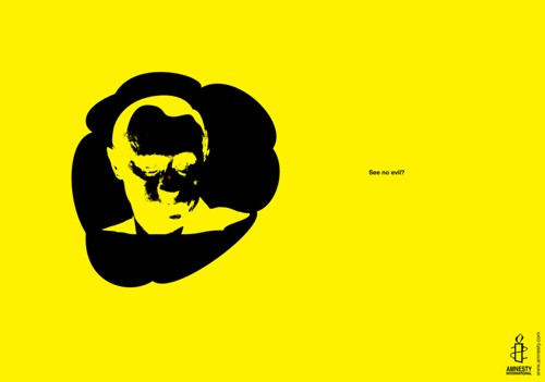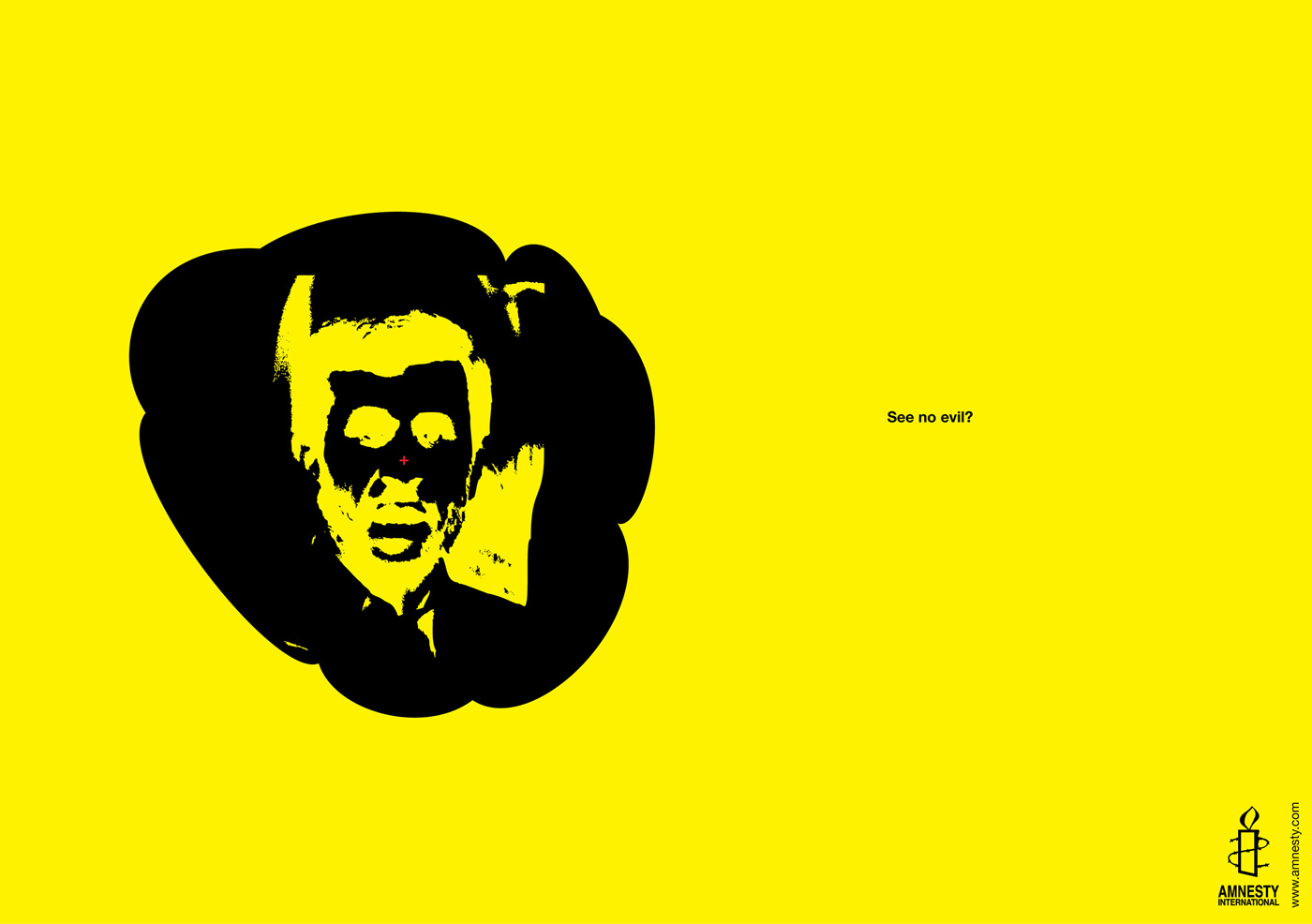 Amnesty International записала Путина в злодеиAmnesty International продолжает нападать на лидеров мира сего. В список злодеев попали бывший президент России Владимир Путин, Джордж Буш, президент Ирана Махмуд Ахмадинежад, глава Северной Кореи Ким Чен Ир, а также китайский лидер Ху Цзиньтао. Серия принтов представляет их как олицетворение зла. Необходимо смотреть на красный крест на постерах в течение 30 секунд, а затем отвести голову назад и взглянуть на потолок, закрывая медленно глаза. Слоган звучит как: не видите зла?Состав творческой группы: Агентство: Lins, Malaysia Креативный директор: Eugene Yap Арт-директор: Eugene Yap, Yin Sau Lun Копирайтер: Sueann Kong Иллюстратор: Chris, Azman & Anson |