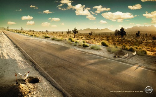 Куры пользуются подземным переходом, когда на дороги выезжает Nissan Altima SE-RАмериканское подразделение агентства TBWA – TBWAChiatDay по заказу Nissan Motor Company приготовило очередной принт для рекламы автомобиля Nissan Altima. В прошлом году TBWAChiatDay уже создавало плакаты для этого автомобиля, показав в виде миниатюрных моделей его самые лучшие качества. Сегодняшний принт предлагает восхититься другим его свойством – мощностью модификации SE-R. Отличительные черты этой модификации Altima состоят в том, что это в первую очередь 3,5 литровый двигатель V6 (280 л.с.), спортивные, отделанные кожей сидения и спортивный руль. А самое главное – это просторный салон. Но простор нужен не только в салоне, но и дороге. И чтобы не рисковать своей жизнь, курицы предпочитают переходить дорогу под землей…