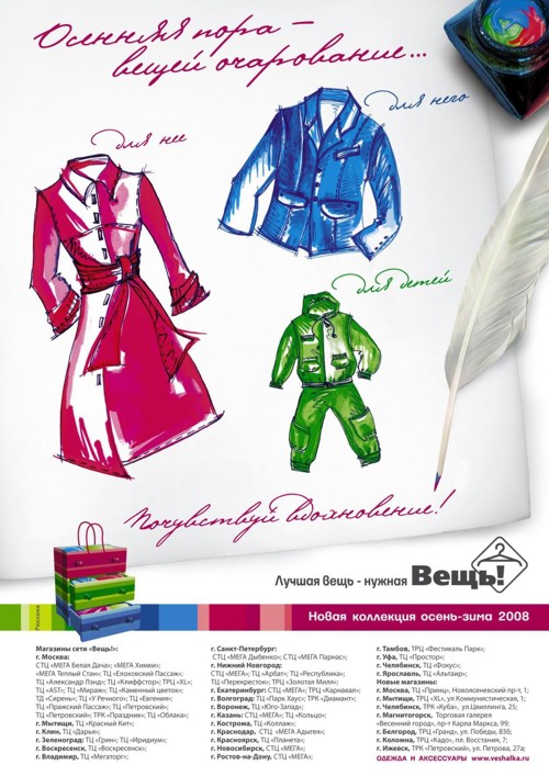 AVIATOR - "Вещь!"В начале сентября стартует федеральная рекламная кампания Торговой сети "Вещь!", приуроченная к появлению в магазинах сети новой осенней коллекции. Кампания пройдет под слоганом "Осенняя пора - вещей очарование. Почувствуй вдохновение!".Одним из требований, предъявленных клиентом к креативной концепции, было сохранение стилистического единства с предыдущими рекламными материалами сети. В частности, необходимо было интегрировать в рекламные макеты элемент из предыдущей креативной концепции сети "Вещь!" - трехцветный комод, а также использовать слоган сети "Лучшая вещь - нужная вещь!". В стилистике разработанной концепции создана серия имиджевых макетов для прессы и различных носителей наружной рекламы. В рекламной кампании будут задействованы федеральные и региональные средства массовой информации, а также метрополитен Москвы и Новосибирска. Состав творческой группы РА AVIATOR Руководитель творческой группы - Александр Нефедов Автор идеи - Сергей Скрыпник Креативные дизайнеры Сергей Скрыпник и Анна Кулик Копирайтер - Екатерина Харитонова Руководитель клиентской группы - Наталья Андреева Торговая сеть "Вещь!" Директор по маркетингу и рекламе Торговой сети "Вещь!" - Наталья Борисова |