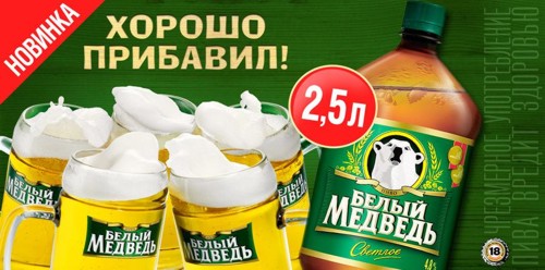 "Белый Медведь" представил на рынке пиво в новой ПЭТ-упаковке объемом 2,5 литра. В поддержку выхода нового объема марки "Белый Медведь" была запущена рекламная кампания. Новая рекламная кампания напоминает о приятных моментах, проведенных на природе с друзьями за традиционной кружкой пива Одна из целей кампании - обратить внимание покупателей на то, что в ассортименте любимой марки появилось пиво в ПЭТ-упаковке большого объема.