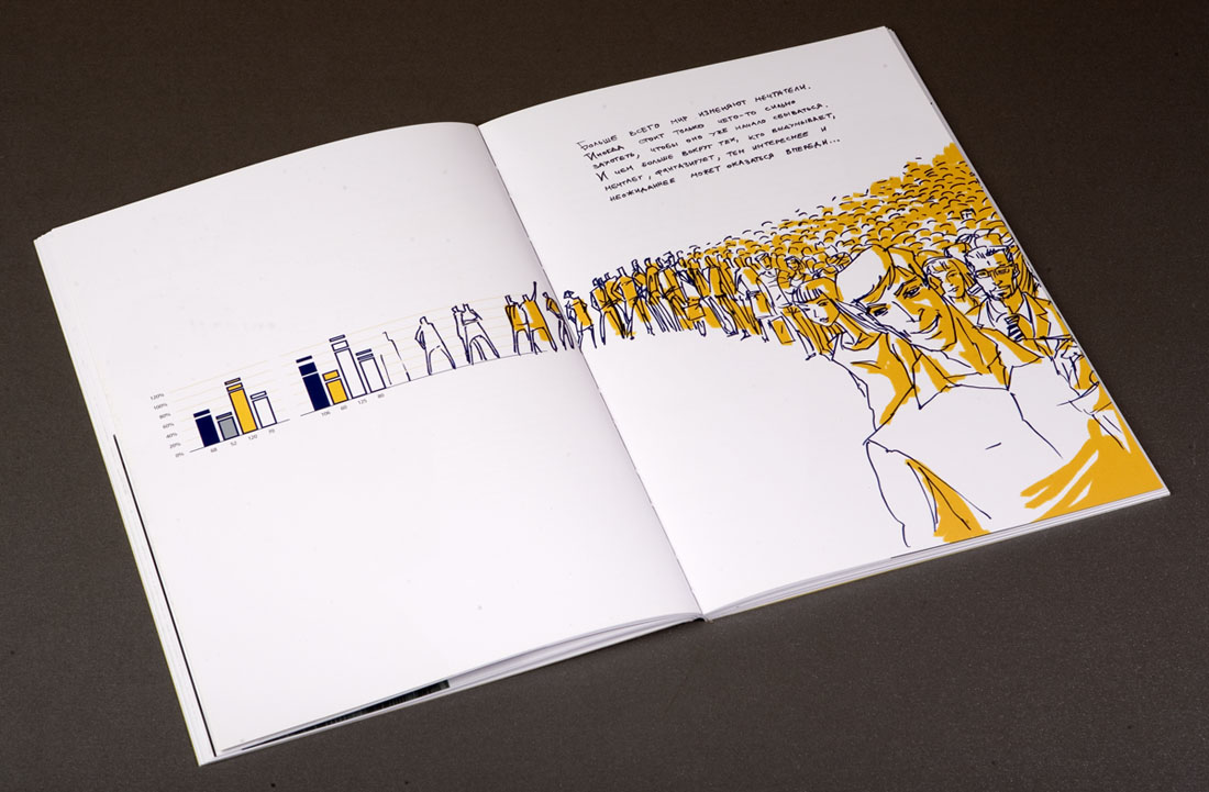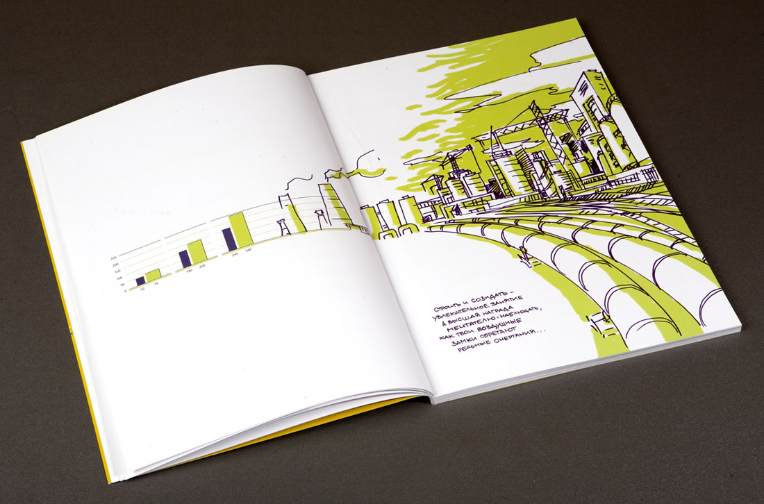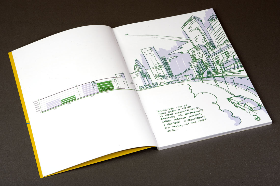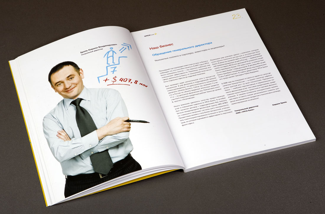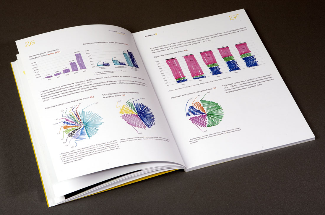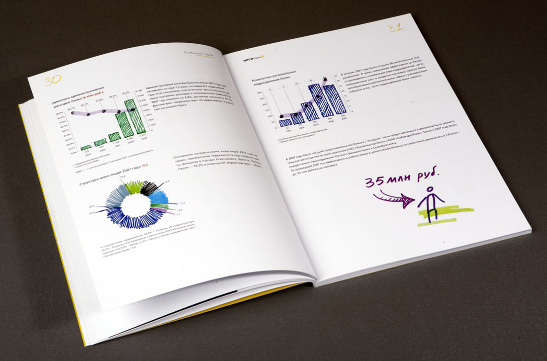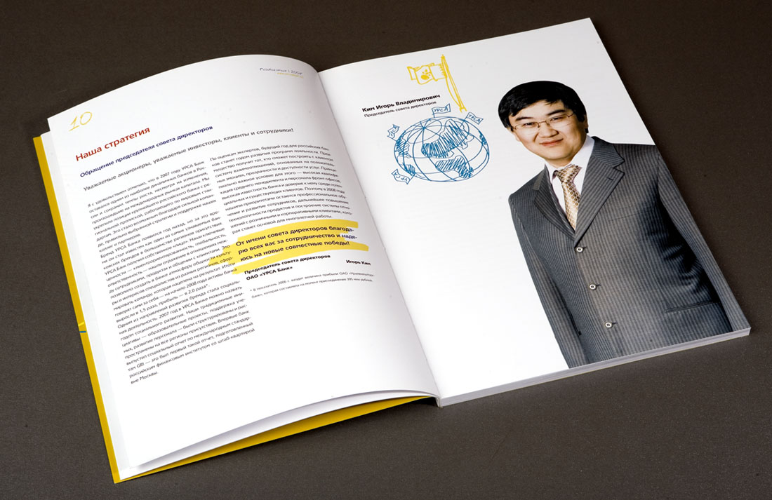 "УРСА Банк" рисует будущееДизайн-студия "Желтая Собака" выпустила годовой отчет для "УРСА Банка""Вдохновлять людей и поддерживать в них стремление к лучшему" - так определили свою миссию сотрудники "УРСА Банка", и именно этот посыл был положен дизайнерами студии в основу для оформления годового отчета. "Мы наглядно решили показать, что за сухими цифрами и фактами стоят живые люди с их собственным эмоциональным пониманием целей своей работы" - говорит директор "Желтой Собаки" Станислав Свердлов. Просматривая отчет, создается впечатление, будто над первоначально строгим лаконичным документом сами сотрудники банка основательно "поработали". "Вооружившись" цветными маркерами и фломастерами, они "собственноручно" выделили в тексте отчета наиболее важные, на их взгляд, места, начертили графики, а в довершении всего каждый, исходя из собственного представления, "изобразил" картинку на тему: "Для чего работает наш банк". В результате сухой финансовый отчет стал напоминать настоящий альбом с рисунками! Из графиков и диаграмм выросли целые картины с разнообразными сюжетами. Кто-то за сухими схемами увидел перспективы развития современного мегаполиса, кто-то - манящую курортную жизнь далекого приморского города. А кто-то вспомнил, что в каждом взрослом живет маленький ребенок со своими простыми искренними фантазиями. Продолжением идеи стала оригинальная упаковка отчета - оранжевая холщевая сумка художника и набор цветных маркеров. Это своеобразный призыв банка к клиентам не бояться фантазировать, мыслить широко и смело, нарисовать мечту и уверенно идти к ее осуществлению. Сумку украшает преобразованный из логотипа банка "нарисованный" воздушный змей - символ мечтательности и постоянного стремления вверх. По словам Станислава Свердлова, подобная подача материала позволила передать стремление банка к созиданию, к выстраиванию новых отношений с клиентами, желание помогать тем, кто готов постоянно расти и двигаться вперед. В целом же, по мнению директора студии, отчет получился ярким, эмоциональным, открытым и очень дружелюбным. |