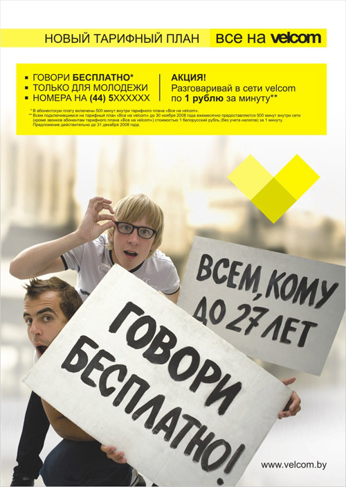 "Крынь" рекламирует VELCOM при помощи двух информационных террористовПервый GSM-оператора в Республике Белаурсь VELCOM вывел на рынок новое предложение "Все на VELCOM". Главная цель - подтянуть позиции оператора в молодежном сегменте по количеству абонентов. Предложение действует только для абонентов в возрасте от 14 до 27 лет. Возможно только одно подключение. Все номера данного тарифного плана будут начинаться на +375 445хххххх. Все, кто подключается на этот план, получают 500 бесплатных минут общения с абонентами данного тарифа.Рекламную поддержку оказывает агентство "Крынь", снявшее три рекламных ролика в стиле телевизионных репортажей. Главные герои роликов "влазят" в эти репортажи и таким образом оказываются в эфире. Их цель - донести до всех своих новость о новом предложении. ![]() ![]() Состав творческой группы: Клиент: Мартин Липауц - заместитель генерального директора по коммерческим вопросам Дина Цибульская - начальник управления маркетинга Дарья Кухаренко - начальник отдела по привлечению новых абонентов Евгений Дуб - начальник отдела продвижения Вера Кузьмицкая - бренд-менеджер Агентство: Дмитрий Курлович - Директор по работе с клиентом Сергей Тишков - Креативный директор Роман Романович - копирайтер Марина Кобзарь - копирайтер Лера Перцова - дизайнер Евгений Грабкин - фотограф Производство: Вледимир Нефедов - продюсер Юрий Ковалев - режиссер Вадим Потеев - оператор Баграт Вартанян - композитор Антонина Раевская - исполнительный продюсер |