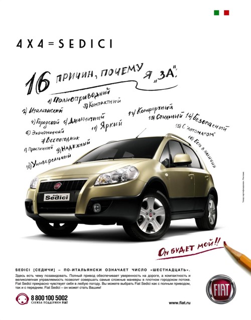Арифметика FIAT от "Иммедиа" Креативная концепция, разработанная коммуникационной группой "Иммедиа" для представительства FIAT в России (FIAT-Sollers), рекомендована для использования во всем мире. Рекламная концепция марки автомобиля FIAT Sedici основывается на формуле: 4 х 4 = 16 (sedici [седичи] по-итальянски означает "шестнадцать"). Цифра 16 выбрана для иллюстрации многочисленных преимуществ FIAT Sedici. Их перечень написан от руки так, как будто его составлял реальный человек, чтобы определиться в выборе. Резюмируется перечень утверждением: "Он будет мой!" Концепция была принята головным офисом FIAT Automobiles S.p.A. и показалась настолько удачной, что было решено не только применить ее в России, но и рекомендовать для использования worldwide - на всех рынках присутствия марки FIAT. Состав творческой группы: Клиент: FIAT-Sollers Представители клиента: Руководитель отдела маркетинга FIAT (пассажирский транспорт): Евгений Муратов Менеджер по дилерскому и коммуникационному маркетингу FIAT: Алена Голышева Агентство: Immedia Креативный директор: Елена Далматова Руководитель креативной группы: Алексей Верекета Арт-директор: Людмила Агафонова Копирайтер: Алексей Коновалов Директор по работе с клиентами: Светлана Рукавишникова Менеджер по работе с клиентами: Наталья Татарчук |