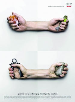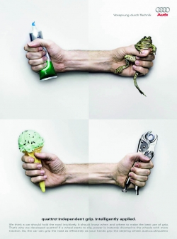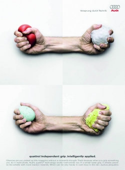 Креативное агентство BBH London создало новый рекламный ролик для Audi, продвигающий технологию независимого сцепления с дорогой, которая используется в автомобилях Audi Quattro. Для того, чтобы наглядно показать, как работает система, креативщики из Bartle Bogle Hegarty сравнили ее с человеческими инстинктами, касающимися контроля и удерживания как одушевленных, так искусственных предметов. В ролике демонстрируется нарезка кадров, в которых две руки одновременно берут разные вещи: попугайчика и камень, губку и помидор, стаканчик мороженного и гаечный ключ… естественно, что сила сжатия, применяемая к этим предметам, разнится в зависимости от таких факторов как хрупкость, возможная деформация и проч. Также, по мнению BBH, работает и система независимого сцепления Quattro, на инстинктивном уровне определяя лучшее решение для каждой конкретной ситуации. На кампанию, включающую в себя наружку, телевидение и печать будет потрачено 8 миллионов долларов. Во всех носителях BBH демонстрирует способность человеческих рук и мозга автоматически соизмерять силу захвата с необходимостью, проводя параллель между колесами автомобиля и руками. Outdoor-элемент кампании в Audi и BBH называют крупнейшей цифровой наружной кампанией в мире. Цифровые панели Quattro будут размещены в Лондонской подземке и на улицах Ливерпуля. Отметим, что технологии Audi Quattro уже 28 лет, но эта кампания под слоганом "Independent grip, intelligently applied" ("Независимое сцепление, примененное с умом") всего лишь третья за все эти годы.